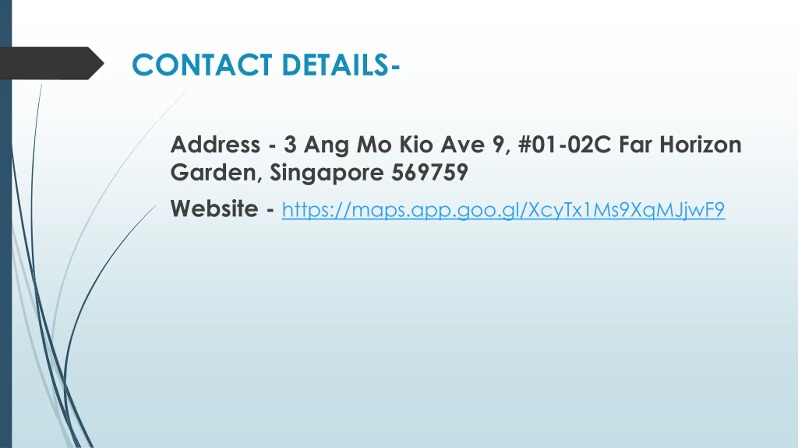 CONTACT DETAILS- Address - 3 Ang Mo Kio Ave 9, #01-02C Far Horizon Garden, Singapore 569759 Website - https://maps.app.goo.gl/XcyTx1Ms9XqMJjwF9