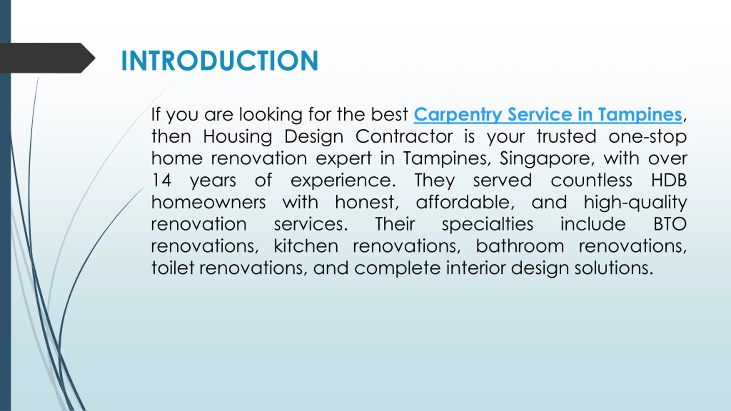INTRODUCTION If you are looking for the best Carpentry Service in Tampines, then Housing Design Contractor is your trusted one-stop home renovation expert in Tampines, Singapore, with over 14 years of experience. They served countless HDB homeowners with honest, affordable, and high-quality renovation services. Their renovations, kitchen renovations, bathroom renovations, toilet renovations, and complete interior design solutions. specialties include BTO