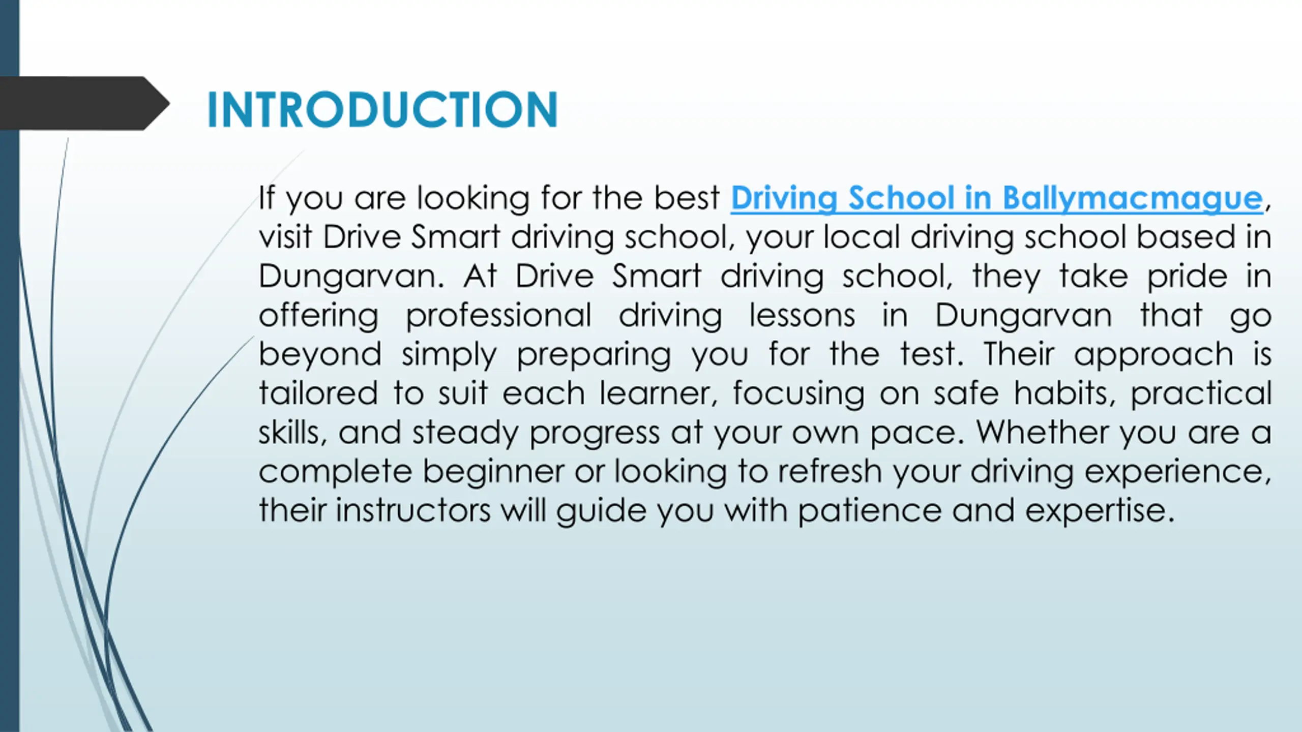 INTRODUCTION If you are looking for the best Driving School in Ballymacmague, visit Drive Smart driving school, your local driving school based in Dungarvan. At Drive Smart driving school, they take pride in offering professional driving lessons in Dungarvan that go beyond simply preparing you for the test. Their approach is tailored to suit each learner, focusing on safe habits, practical skills, and steady progress at your own pace. Whether you are a complete beginner or looking to refresh your driving experience, their instructors will guide you with patience and expertise.