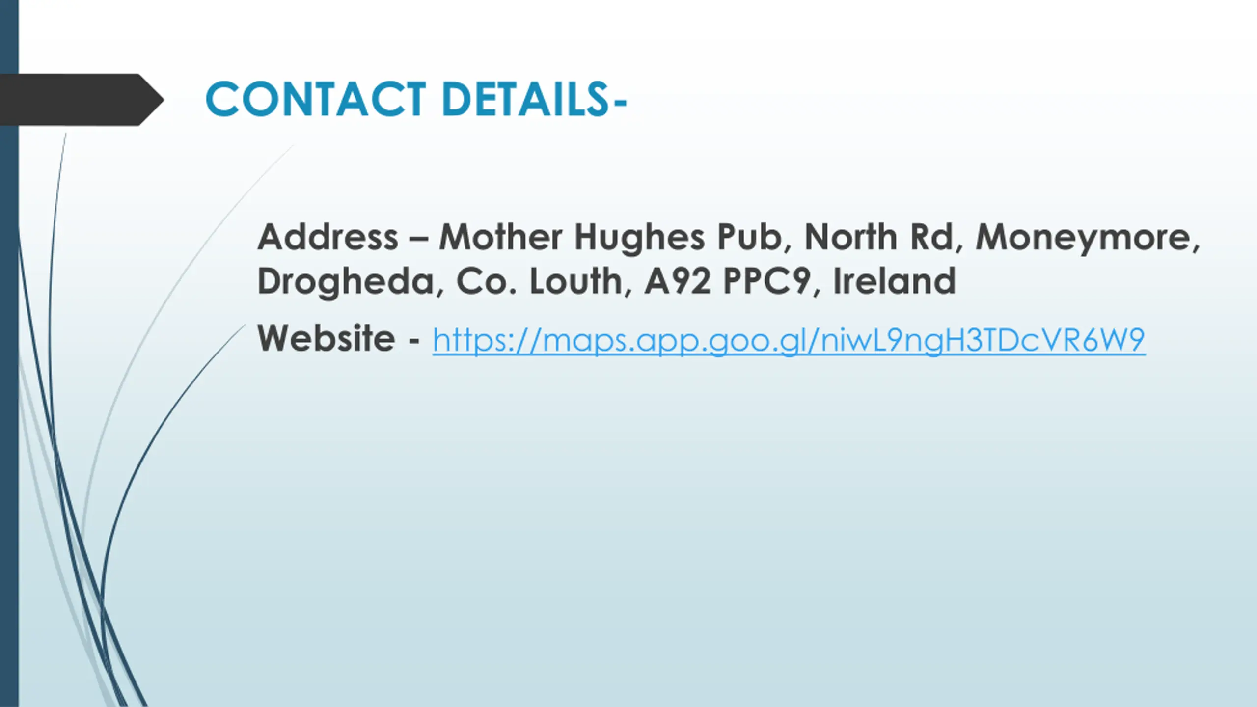 CONTACT DETAILS- Address Mother Hughes Pub, North Rd, Moneymore, Drogheda, Co. Louth, A92 PPC9, Ireland Website - https://maps.app.goo.gl/niwL9ngH3TDcVR6W9