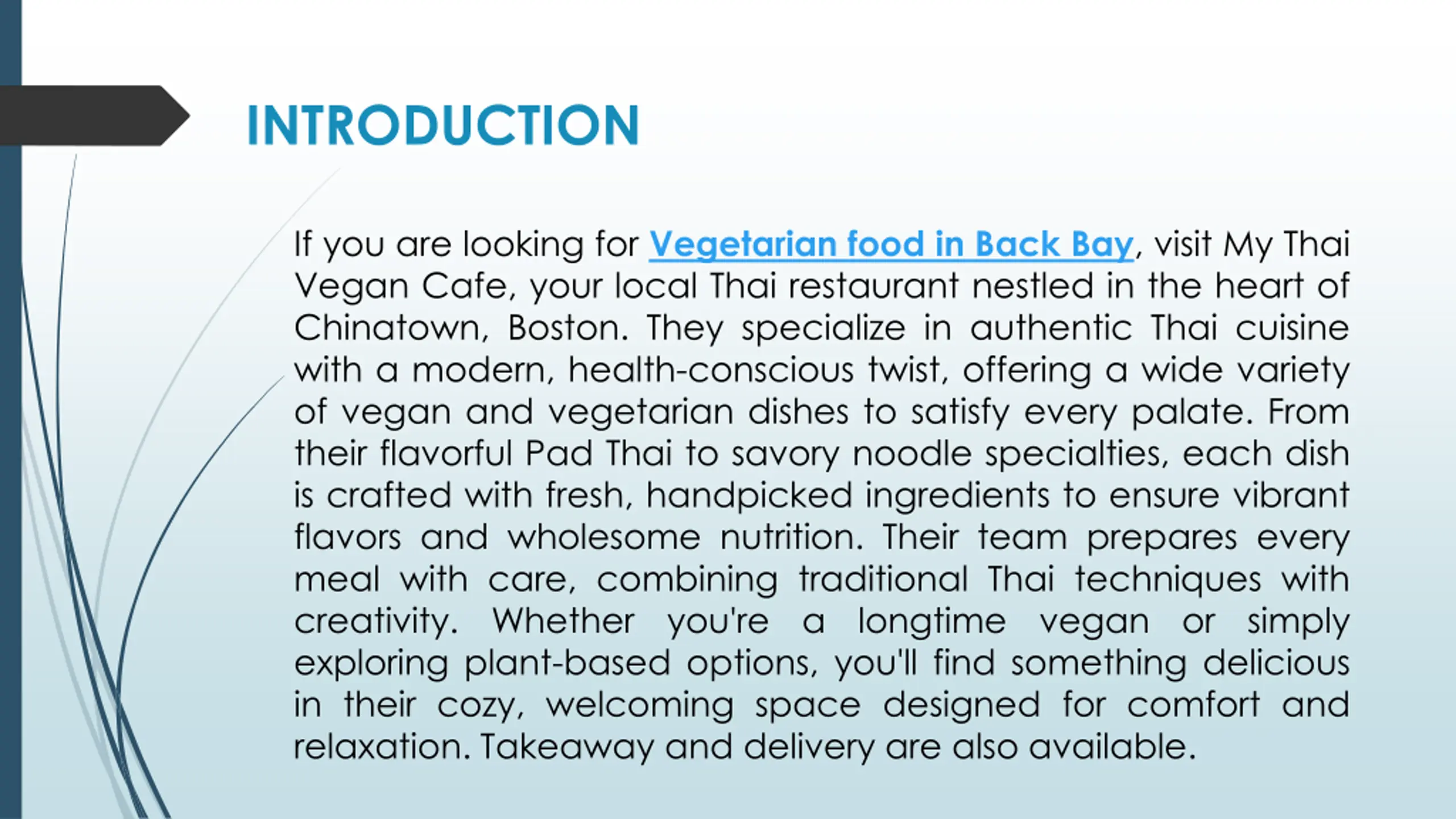 INTRODUCTION If you are looking for Vegetarian food in Back Bay, visit My Thai Vegan Cafe, your local Thai restaurant nestled in the heart of Chinatown, Boston. They specialize in authentic Thai cuisine with a modern, health-conscious twist, offering a wide variety of vegan and vegetarian dishes to satisfy every palate. From their flavorful Pad Thai to savory noodle specialties, each dish is crafted with fresh, handpicked ingredients to ensure vibrant flavors and wholesome nutrition. Their team prepares every meal with care, combining traditional Thai techniques with creativity. Whether you're a longtime vegan or simply exploring plant-based options, you'll find something delicious in their cozy, welcoming space designed for comfort and relaxation. Takeaway and delivery are also available. If you are looking for Vegetarian food in Back Bay, visit My Thai Vegan Cafe, your local Thai restaurant nestled in the heart of Chinatown, Boston. They specialize in authentic Thai cuisine with a modern, health-conscious twist, offering a wide variety of vegan and vegetarian dishes to satisfy every palate. From their flavorful Pad Thai to savory noodle specialties, each dish is crafted with fresh, handpicked ingredients to ensure vibrant flavors and wholesome nutrition. Their team prepares every meal with care, combining traditional Thai techniques with creativity. Whether you're a longtime vegan or simply exploring plant-based options, you'll find something delicious in their cozy, welcoming space designed for comfort and relaxation. Takeaway and delivery are also available.