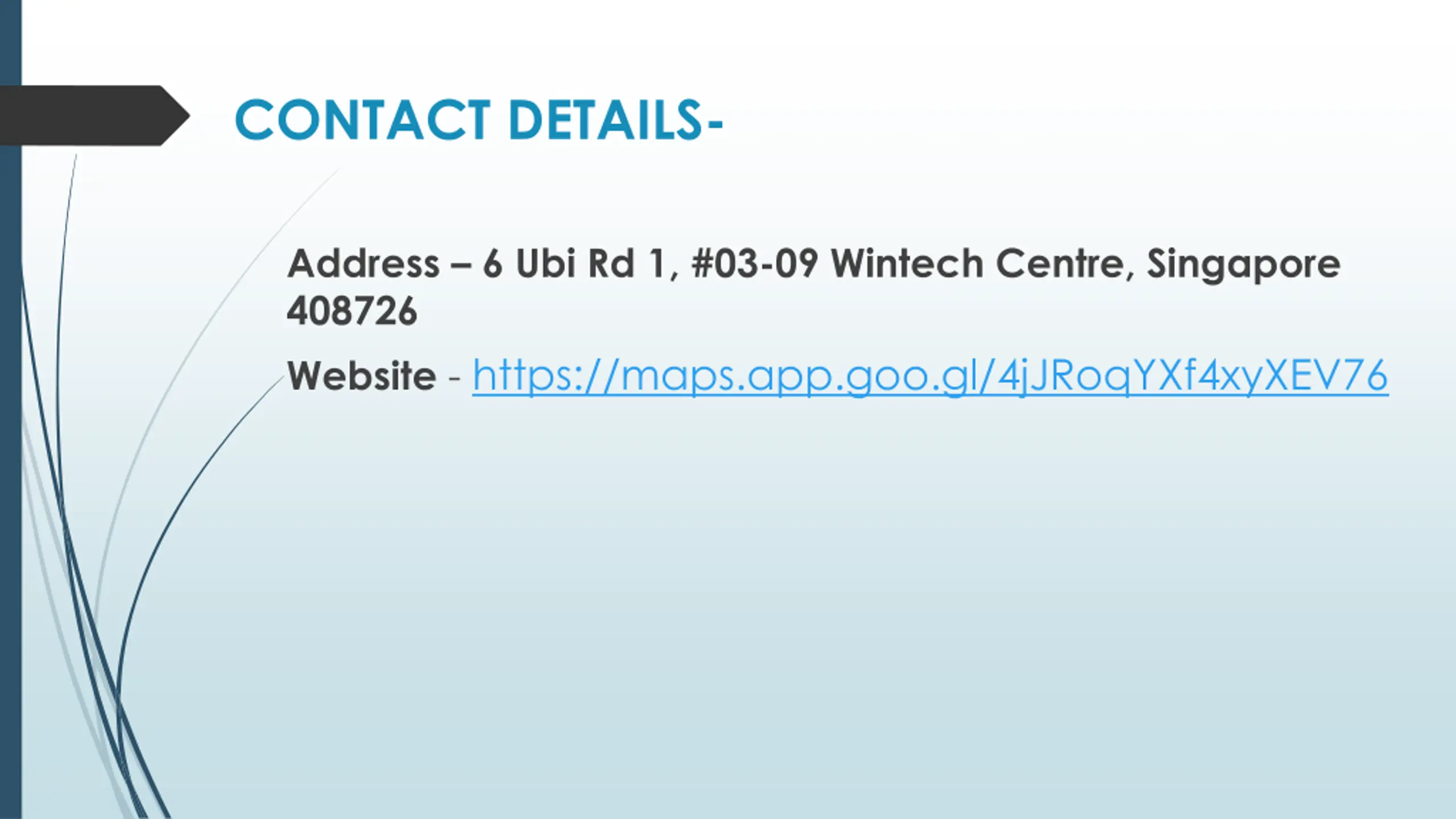 CONTACT DETAILS- Address 6 Ubi Rd 1, #03-09 Wintech Centre, Singapore 408726 Website - https://maps.app.goo.gl/4jJRoqYXf4xyXEV76