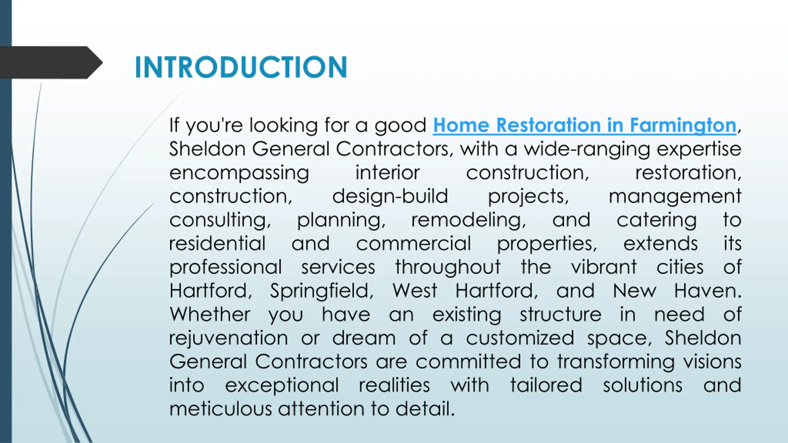 INTRODUCTION If you're looking for a good Home Restoration in Farmington, Sheldon General Contractors, with a wide-ranging expertise encompassing interior construction, design-build consulting, planning, remodeling, residential and commercial professional services throughout the vibrant cities of Hartford, Springfield, West Hartford, and New Haven. Whether you have an existing structure in need of rejuvenation or dream of a customized space, Sheldon General Contractors are committed to transforming visions into exceptional realities with tailored solutions and meticulous attention to detail. construction, projects, restoration, management catering extends and to its properties,