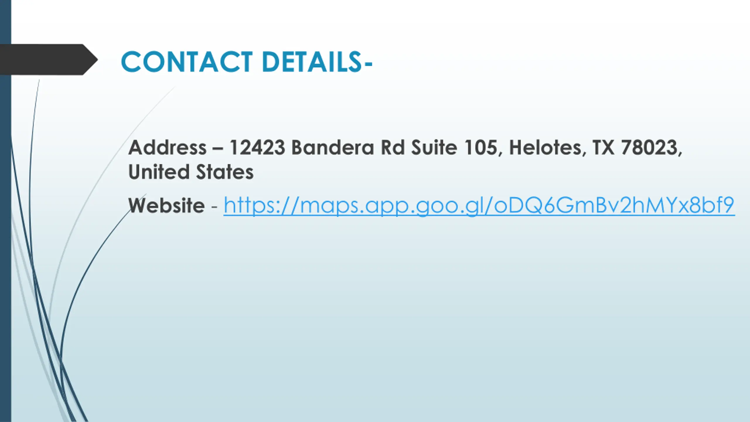 CONTACT DETAILS- Address 12423 Bandera Rd Suite 105, Helotes, TX 78023, United States Website - https://maps.app.goo.gl/oDQ6GmBv2hMYx8bf9