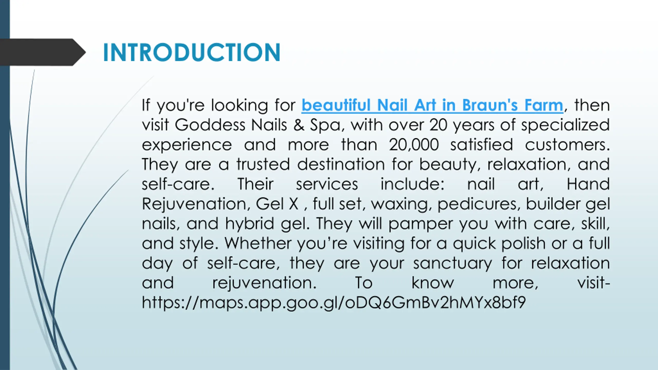 INTRODUCTION If you're looking for beautiful Nail Art in Braun's Farm, then visit Goddess Nails & Spa, with over 20 years of specialized experience and more than 20,000 satisfied customers. They are a trusted destination for beauty, relaxation, and self-care. Their services Rejuvenation, Gel X , full set, waxing, pedicures, builder gel nails, and hybrid gel. They will pamper you with care, skill, and style. Whether you re visiting for a quick polish or a full day of self-care, they are your sanctuary for relaxation and rejuvenation. To https://maps.app.goo.gl/oDQ6GmBv2hMYx8bf9 include: nail art, Hand know more, visit-