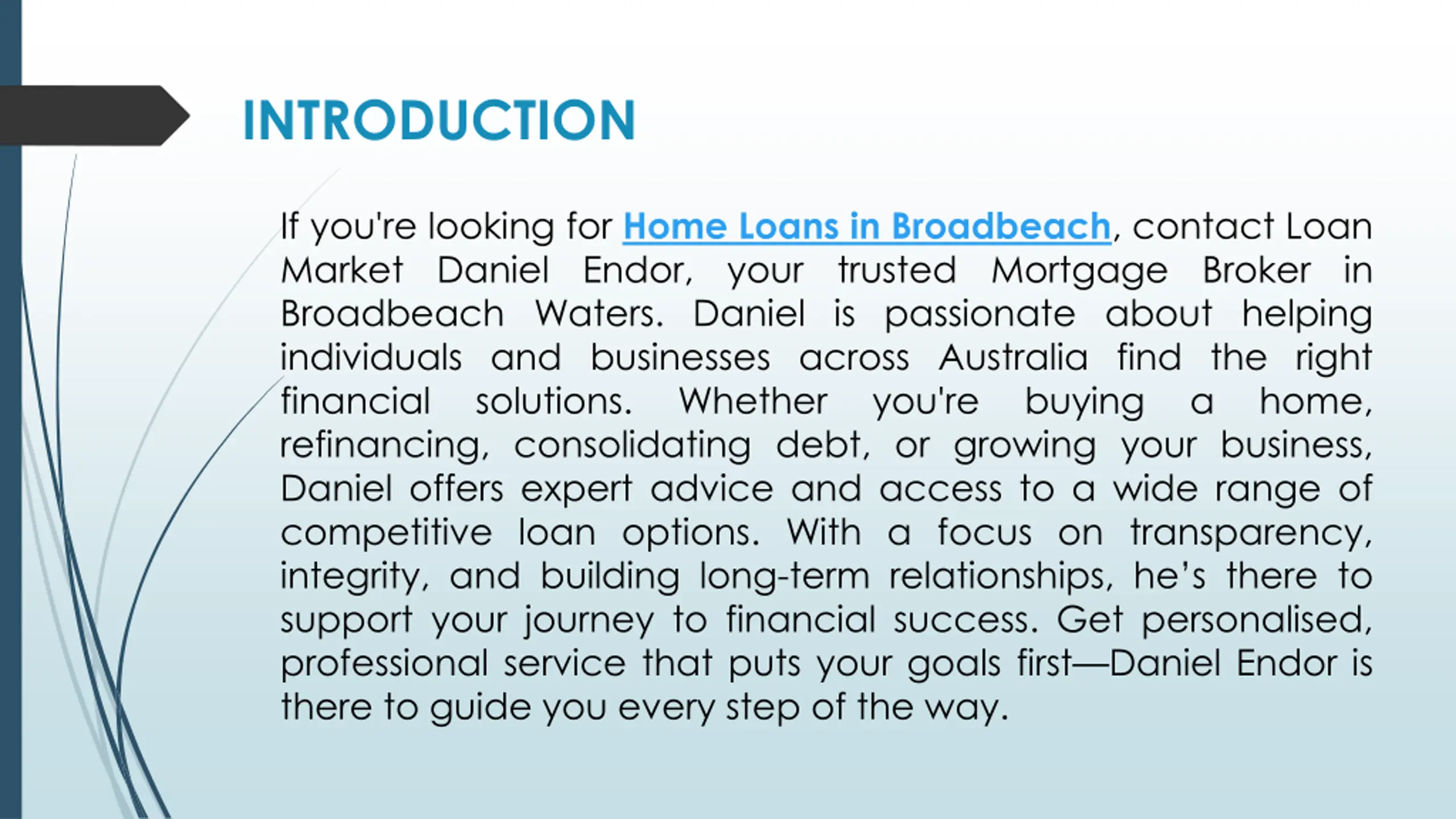 INTRODUCTION If you're looking for Home Loans in Broadbeach, contact Loan Market Daniel Endor, your trusted Mortgage Broker in Broadbeach Waters. Daniel is passionate about helping individuals and businesses across Australia find the right financial solutions. Whether refinancing, consolidating debt, or growing your business, Daniel offers expert advice and access to a wide range of competitive loan options. With a focus on transparency, integrity, and building long-term relationships, he s there to support your journey to financial success. Get personalised, professional service that puts your goals first Daniel Endor is there to guide you every step of the way. you're buying a home,