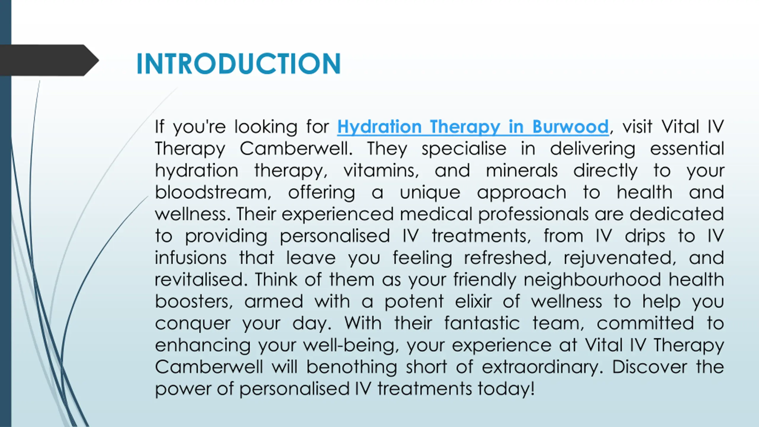 INTRODUCTION If you're looking for Hydration Therapy in Burwood, visit Vital IV Therapy Camberwell. They specialise in delivering essential hydration therapy, vitamins, and minerals directly to your bloodstream, offering a unique approach to health and wellness. Their experienced medical professionals are dedicated to providing personalised IV treatments, from IV drips to IV infusions that leave you feeling refreshed, rejuvenated, and revitalised. Think of them as your friendly neighbourhood health boosters, armed with a potent elixir of wellness to help you conquer your day. With their fantastic team, committed to enhancing your well-being, your experience at Vital IV Therapy Camberwell will benothing short of extraordinary. Discover the power of personalised IV treatments today!