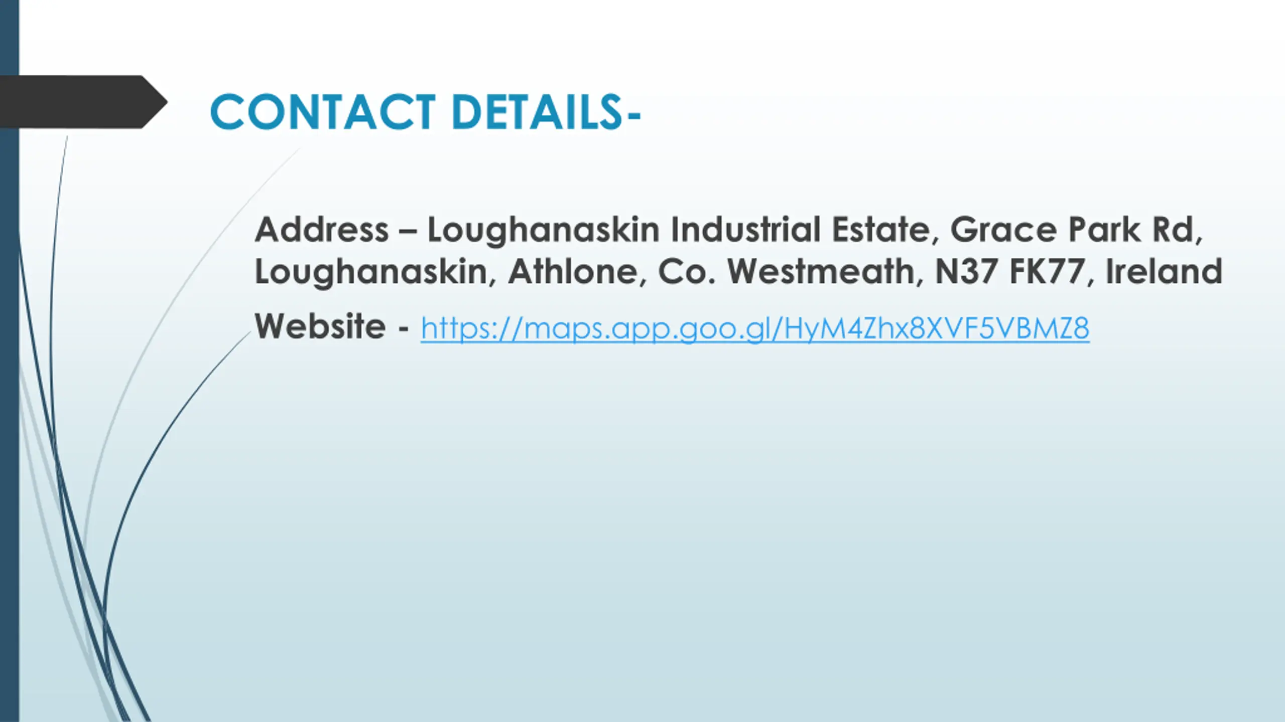 CONTACT DETAILS- Address Loughanaskin Industrial Estate, Grace Park Rd, Loughanaskin, Athlone, Co. Westmeath, N37 FK77, Ireland Website - https://maps.app.goo.gl/HyM4Zhx8XVF5VBMZ8