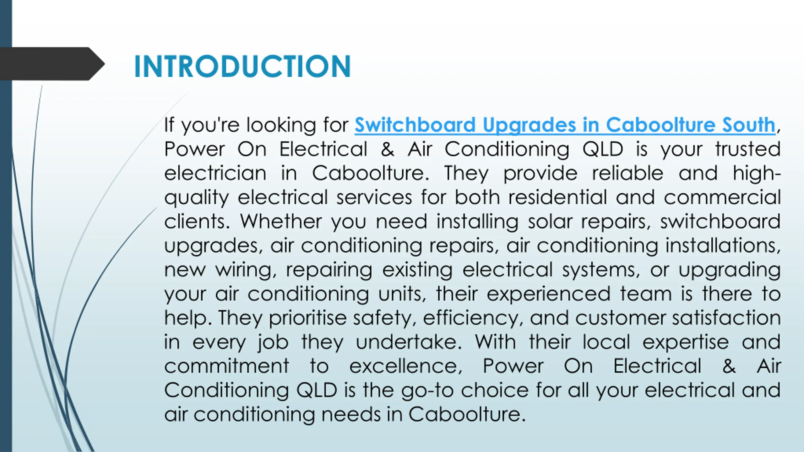 INTRODUCTION If you're looking for Switchboard Upgrades in Caboolture South, Power On Electrical & Air Conditioning QLD is your trusted electrician in Caboolture. They provide reliable and high- quality electrical services for both residential and commercial clients. Whether you need installing solar repairs, switchboard upgrades, air conditioning repairs, air conditioning installations, new wiring, repairing existing electrical systems, or upgrading your air conditioning units, their experienced team is there to help. They prioritise safety, efficiency, and customer satisfaction in every job they undertake. With their local expertise and commitment to excellence, Power On Electrical & Air Conditioning QLD is the go-to choice for all your electrical and air conditioning needs in Caboolture.