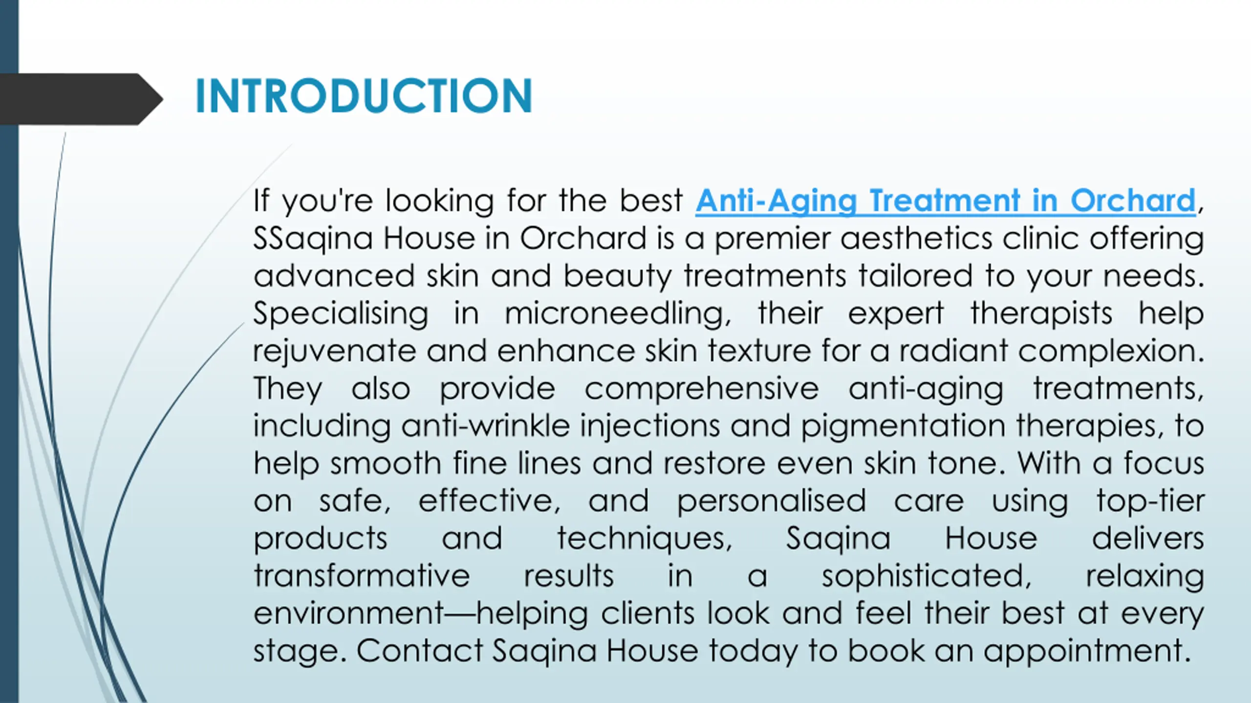 INTRODUCTION If you're looking for the best Anti-Aging Treatment in Orchard, SSaqina House in Orchard is a premier aesthetics clinic offering advanced skin and beauty treatments tailored to your needs. Specialising in microneedling, their expert therapists help rejuvenate and enhance skin texture for a radiant complexion. They also provide comprehensive anti-aging treatments, including anti-wrinkle injections and pigmentation therapies, to help smooth fine lines and restore even skin tone. With a focus on safe, effective, and personalised care using top-tier products and techniques, transformative results in environment helping clients look and feel their best at every stage. Contact Saqina House today to book an appointment. Saqina sophisticated, House delivers relaxing a