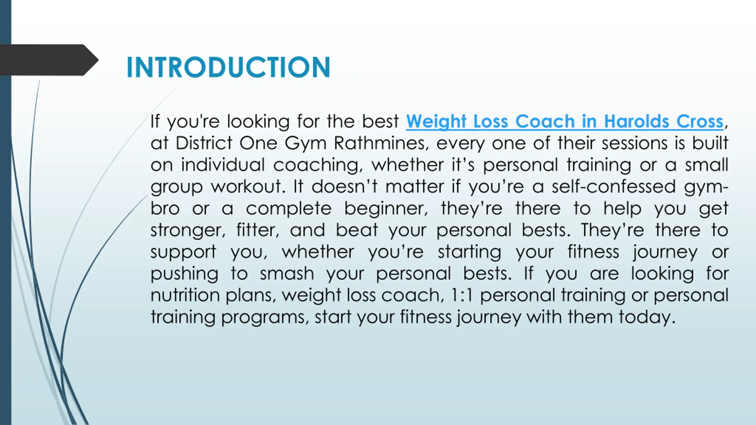 INTRODUCTION If you're looking for the best Weight Loss Coach in Harolds Cross, at District One Gym Rathmines, every one of their sessions is built on individual coaching, whether it s personal training or a small group workout. It doesn t matter if you re a self-confessed gym- bro or a complete beginner, they re there to help you get stronger, fitter, and beat your personal bests. They re there to support you, whether you re starting your fitness journey or pushing to smash your personal bests. If you are looking for nutrition plans, weight loss coach, 1:1 personal training or personal training programs, start your fitness journey with them today.