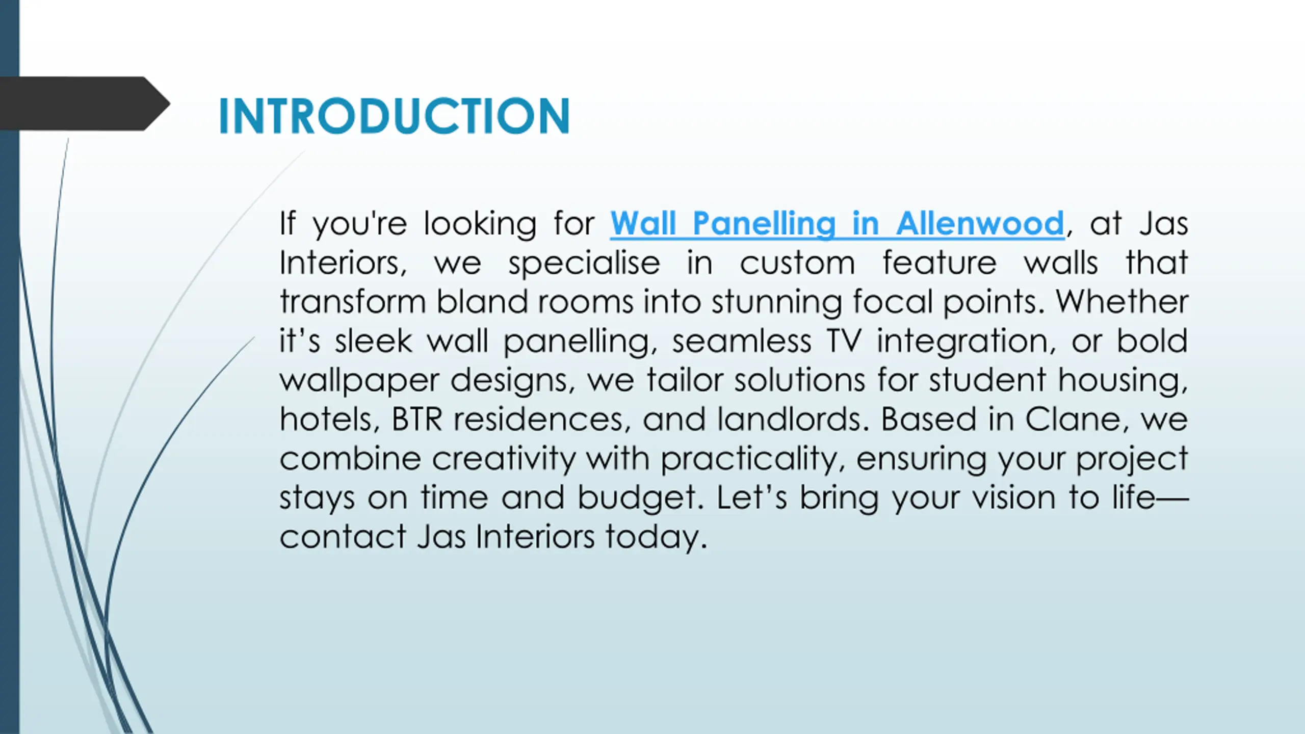 INTRODUCTION If you're looking for Wall Panelling in Allenwood, at Jas Interiors, we specialise in custom feature walls that transform bland rooms into stunning focal points. Whether it s sleek wall panelling, seamless TV integration, or bold wallpaper designs, we tailor solutions for student housing, hotels, BTR residences, and landlords. Based in Clane, we combine creativity with practicality, ensuring your project stays on time and budget. Let s bring your vision to life contact Jas Interiors today.