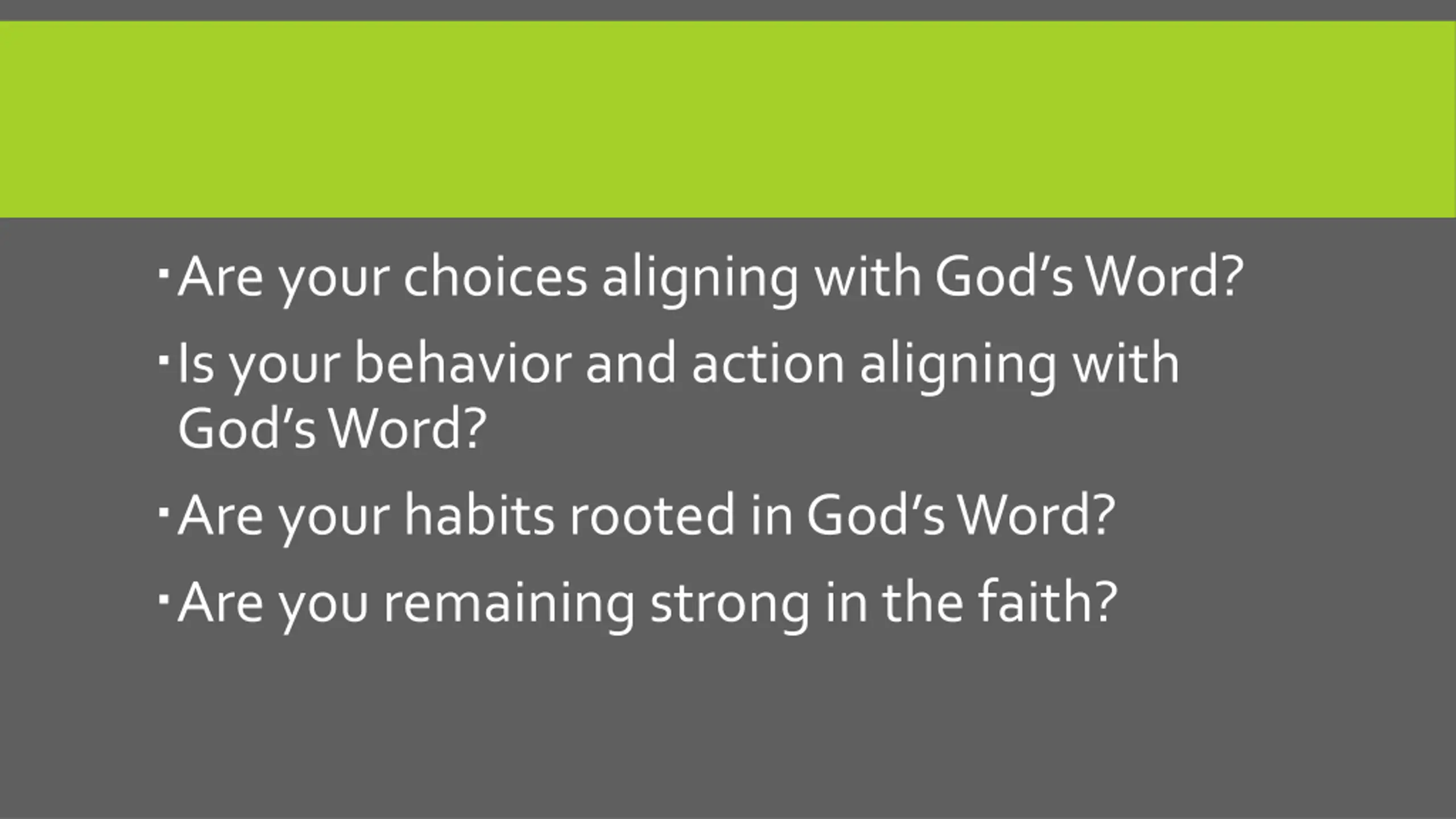 Are your choices aligning with Gods Word? Is your behavior and action aligning with God s Word? Are your habits rooted in God s Word? Are you remaining strong in the faith?
