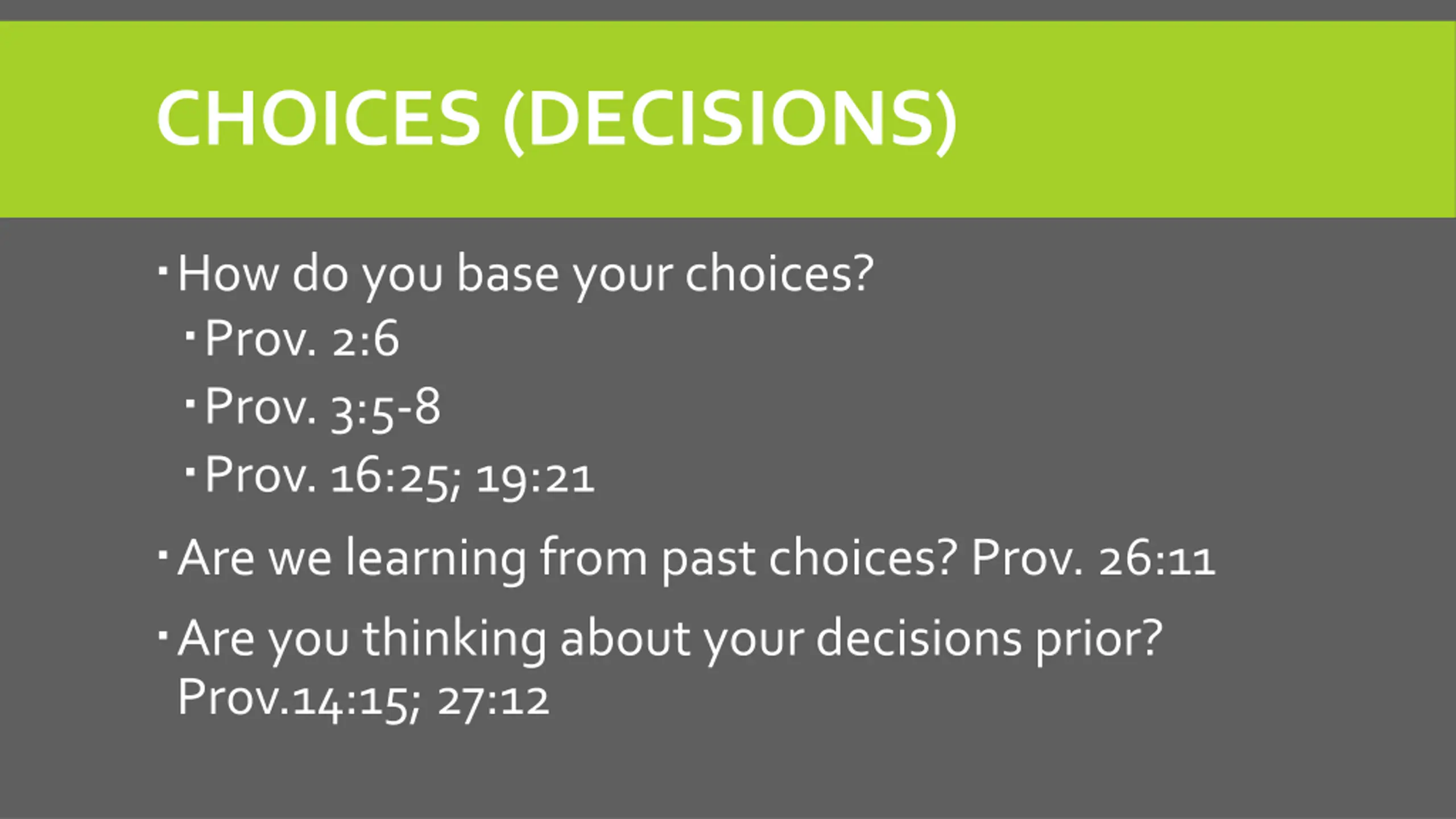 CHOICES (DECISIONS) How do you base your choices? Prov. 2:6 Prov. 3:5-8 Prov. 16:25; 19:21 Are we learning from past choices? Prov. 26:11 Are you thinking about your decisions prior? Prov.14:15; 27:12