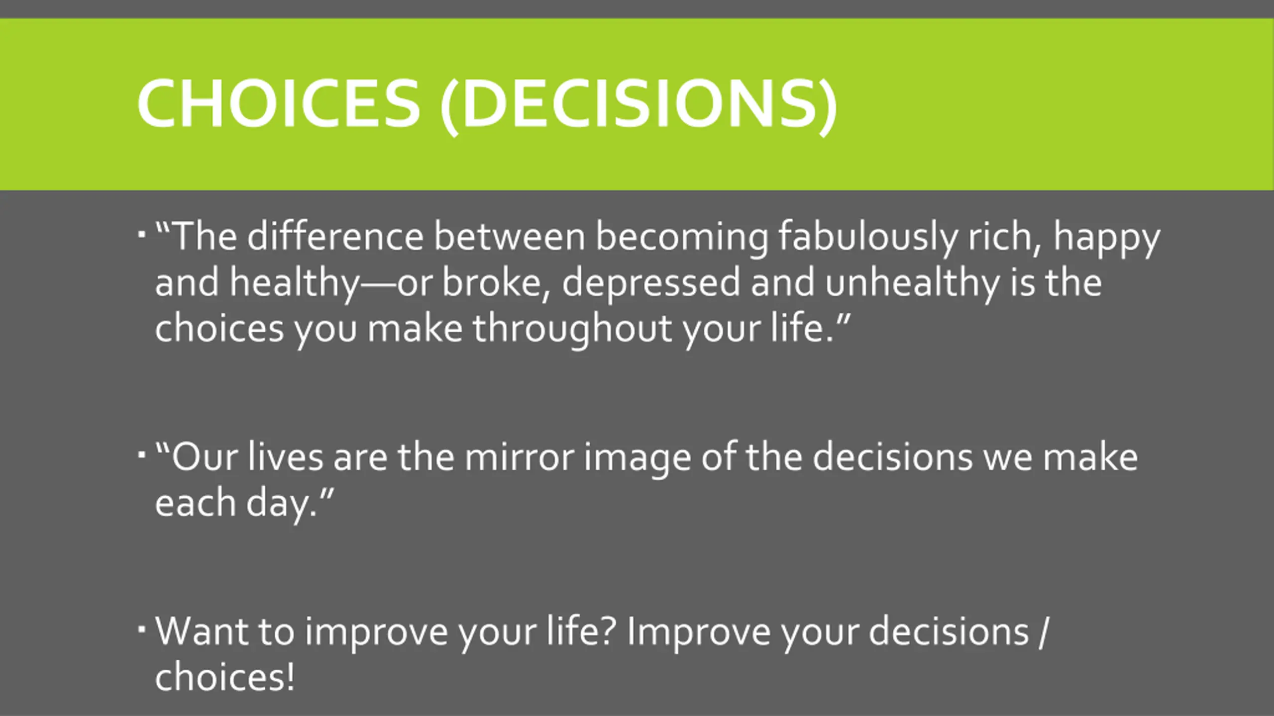 CHOICES (DECISIONS) The difference between becoming fabulously rich, happy and healthy or broke, depressed and unhealthy is the choices you make throughout your life. Ourlives are the mirror image of the decisionswe make each day. Want to improve your life? Improve your decisions / choices!