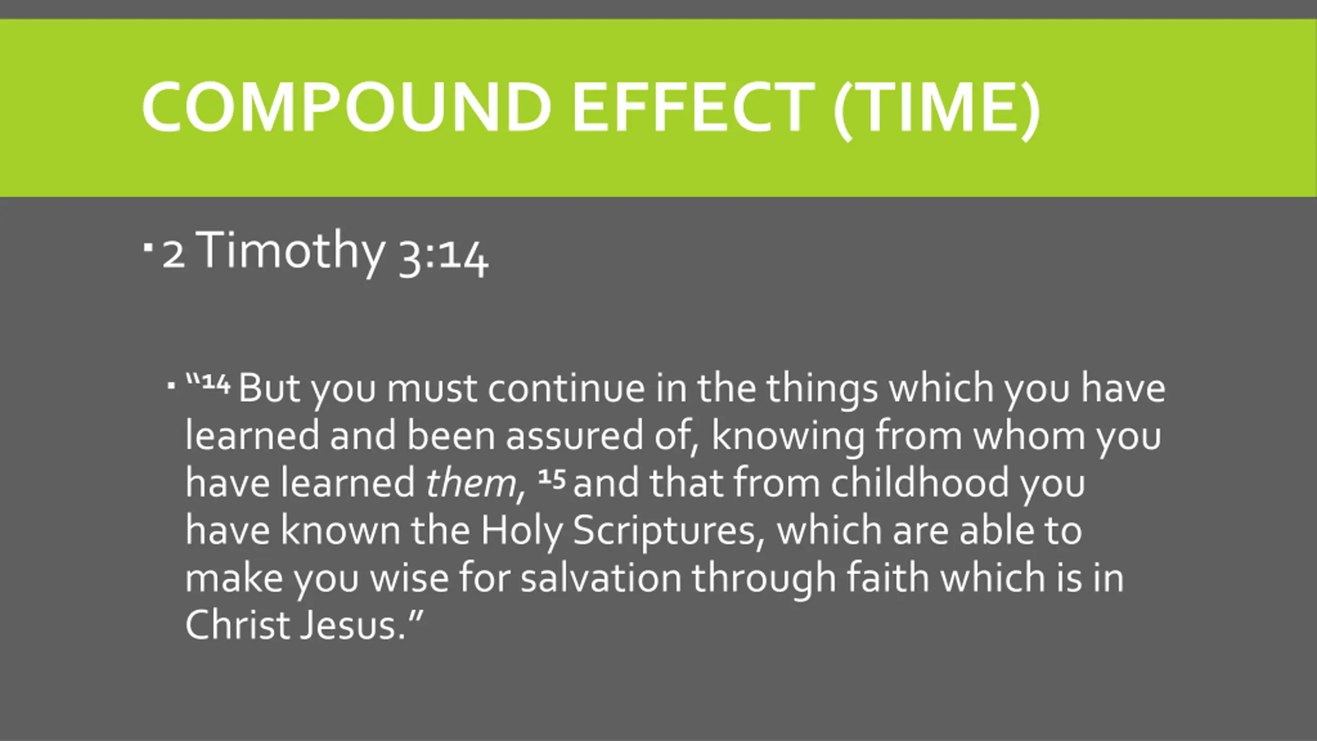COMPOUND EFFECT (TIME) 2 Timothy 3:14 14But you must continue in the things which you have learned and been assured of, knowing from whom you have learnedthem,15and that from childhood you have known the Holy Scriptures, which are able to make you wise for salvation through faith which is in Christ Jesus.