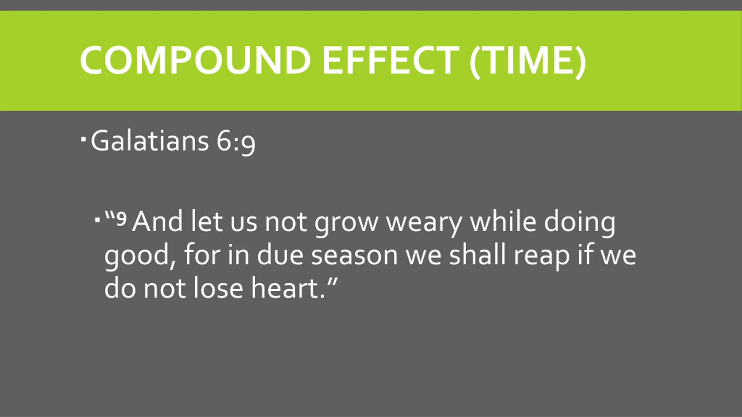 COMPOUND EFFECT (TIME) Galatians 6:9 9And let us not grow weary while doing good, for in due season we shall reap if we do not lose heart.