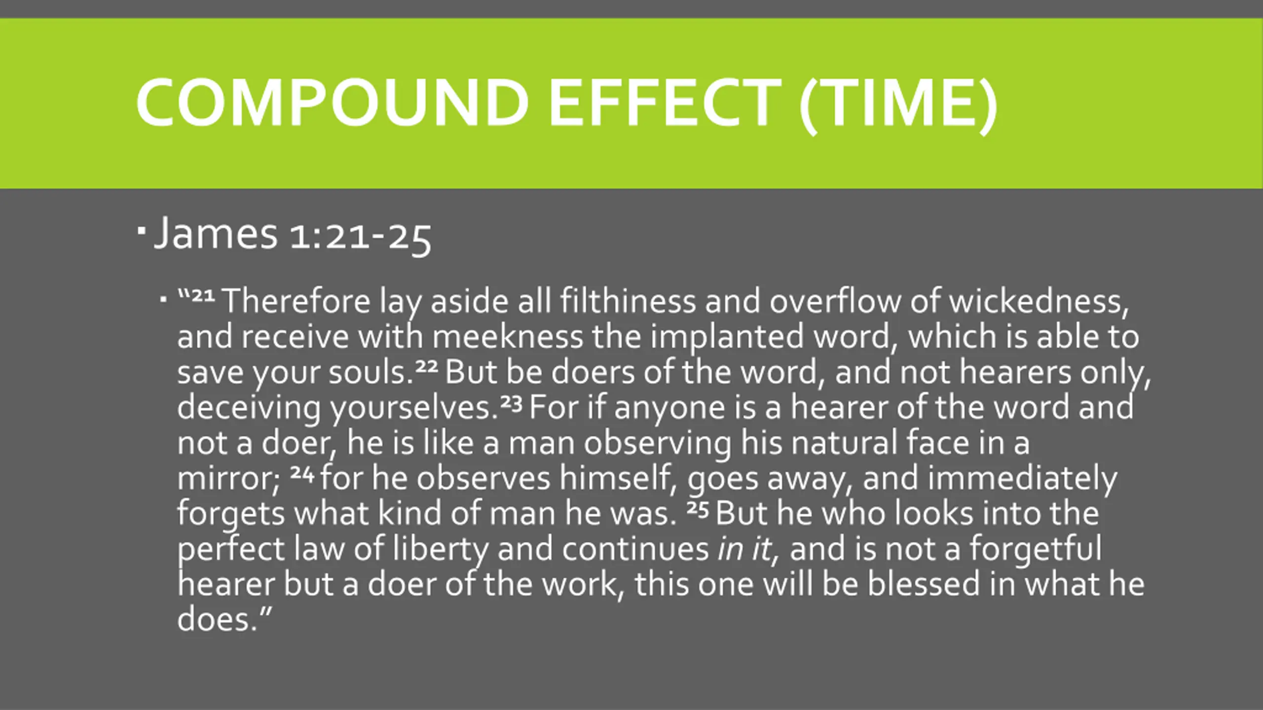 COMPOUND EFFECT (TIME) James 1:21-25 21Therefore lay aside all filthiness and overflow of wickedness, and receive with meekness the implanted word, which is able to save your souls.22But be doers of the word, and not hearers only, deceiving yourselves.23For if anyone is a hearer of the word and not a doer, he is like a man observing his natural face in a mirror;24for he observes himself, goes away, and immediately forgets what kind of man he was.25But he who looks into the perfect law of liberty and continues in it,and is not a forgetful hearer but a doer of the work, this one will be blessed in what he does.