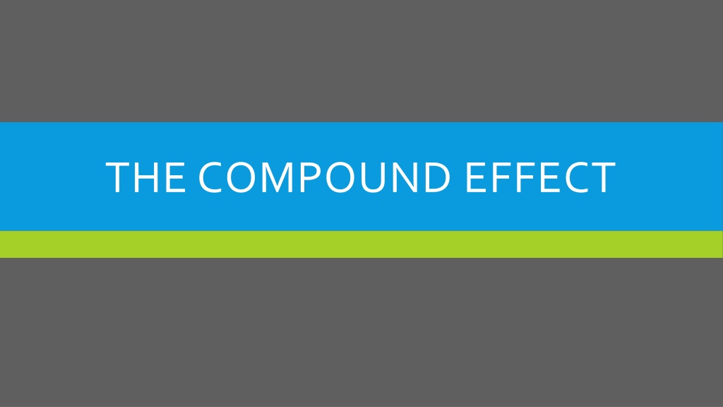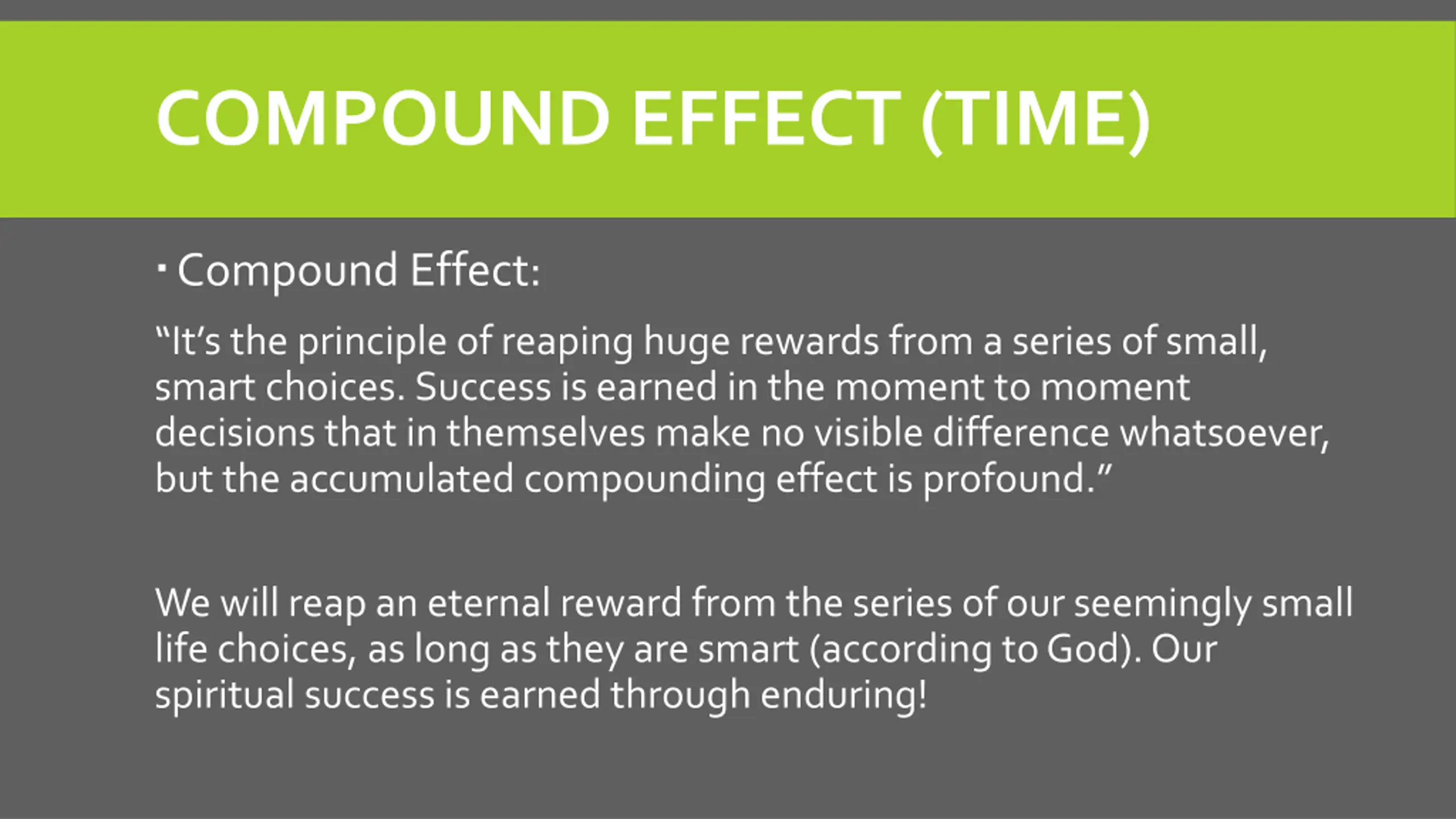 COMPOUND EFFECT (TIME) Compound Effect: It s the principle of reaping huge rewards from a series of small, smart choices. Success is earned in the moment to moment decisions that in themselves make no visible difference whatsoever, but the accumulated compounding effect is profound. We will reap an eternal reward from the series of our seemingly small life choices, as long as they are smart (according to God). Our spiritual success is earned through enduring!