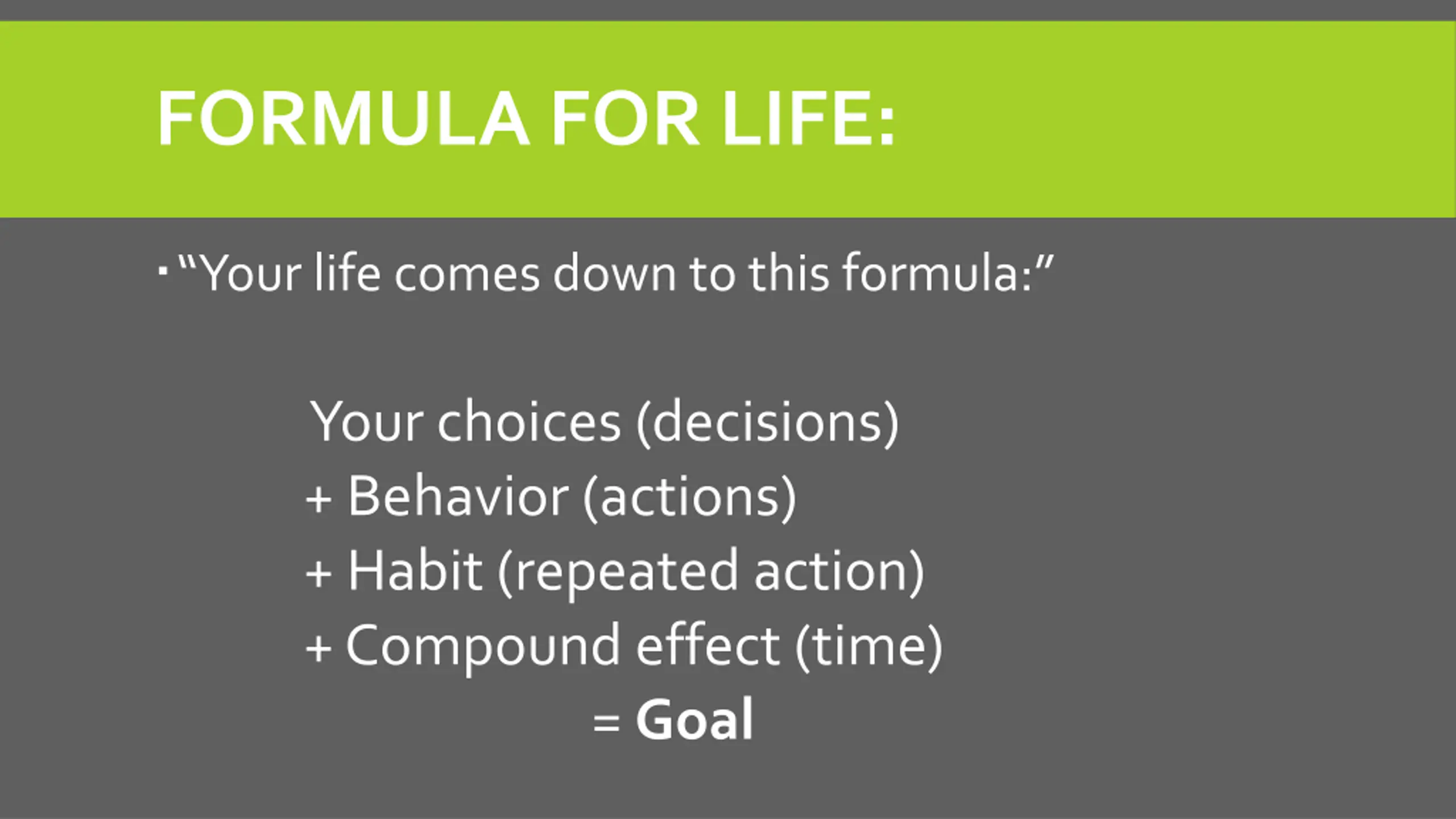 FORMULA FOR LIFE: Your life comes down to this formula: Your choices (decisions) + Behavior (actions) + Habit (repeated action) + Compound effect (time) = Goal
