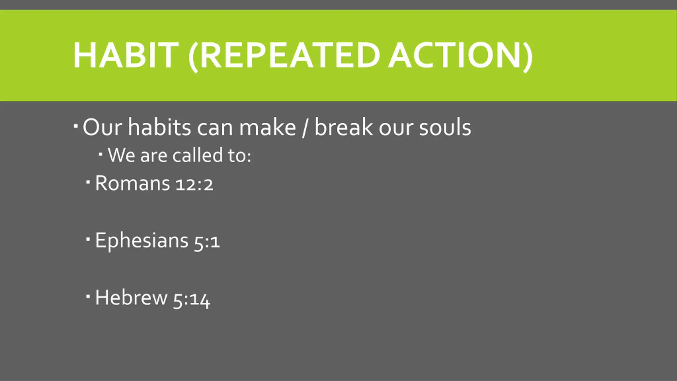 HABIT (REPEATED ACTION) Our habits can make / break our souls We are called to: Romans 12:2 Ephesians 5:1 Hebrew 5:14