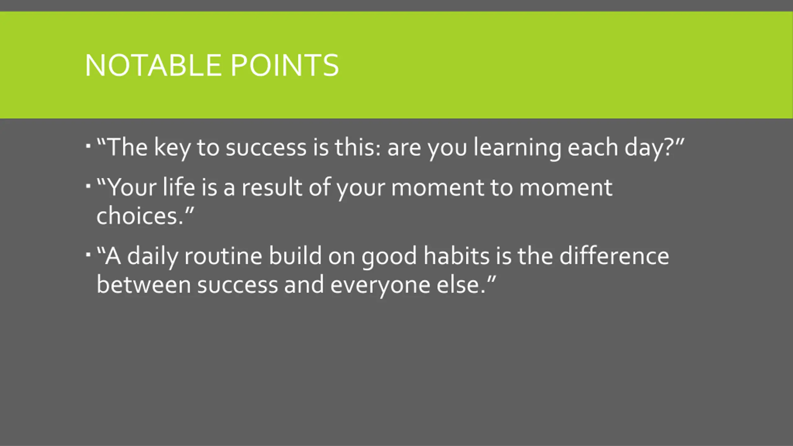 NOTABLE POINTS The key to success is this: are you learning each day? Your life is a result of your moment to moment choices. A daily routine build on good habits is the difference between success and everyone else.