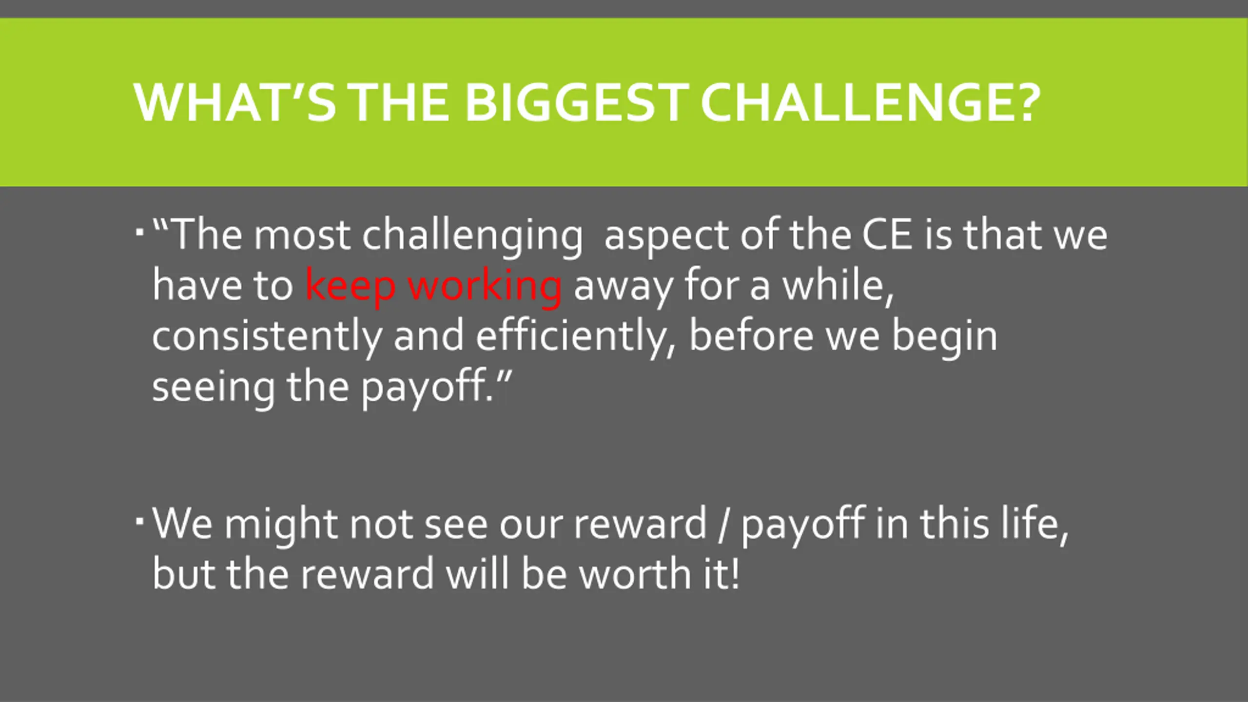 WHATS THE BIGGEST CHALLENGE? The most challenging aspect of the CE is that we have to keep working away for a while, consistently and efficiently, before we begin seeing the payoff. We might not see our reward / payoff in this life, but the reward will be worth it!