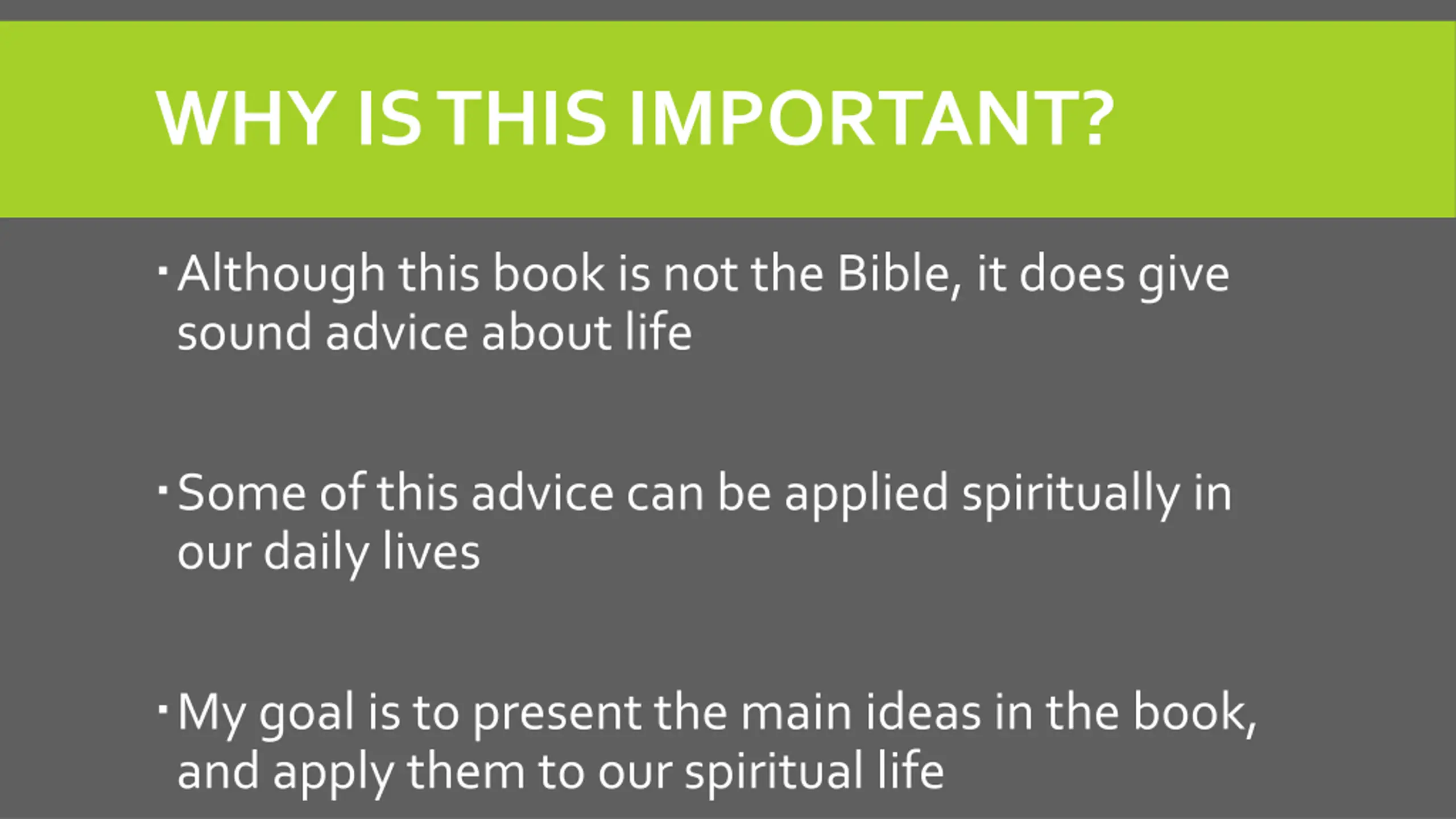 WHY IS THIS IMPORTANT? Although this book is not the Bible, it does give sound advice about life Some of this advice can be applied spiritually in our daily lives My goal is to present the main ideas in the book, and apply them to our spiritual life