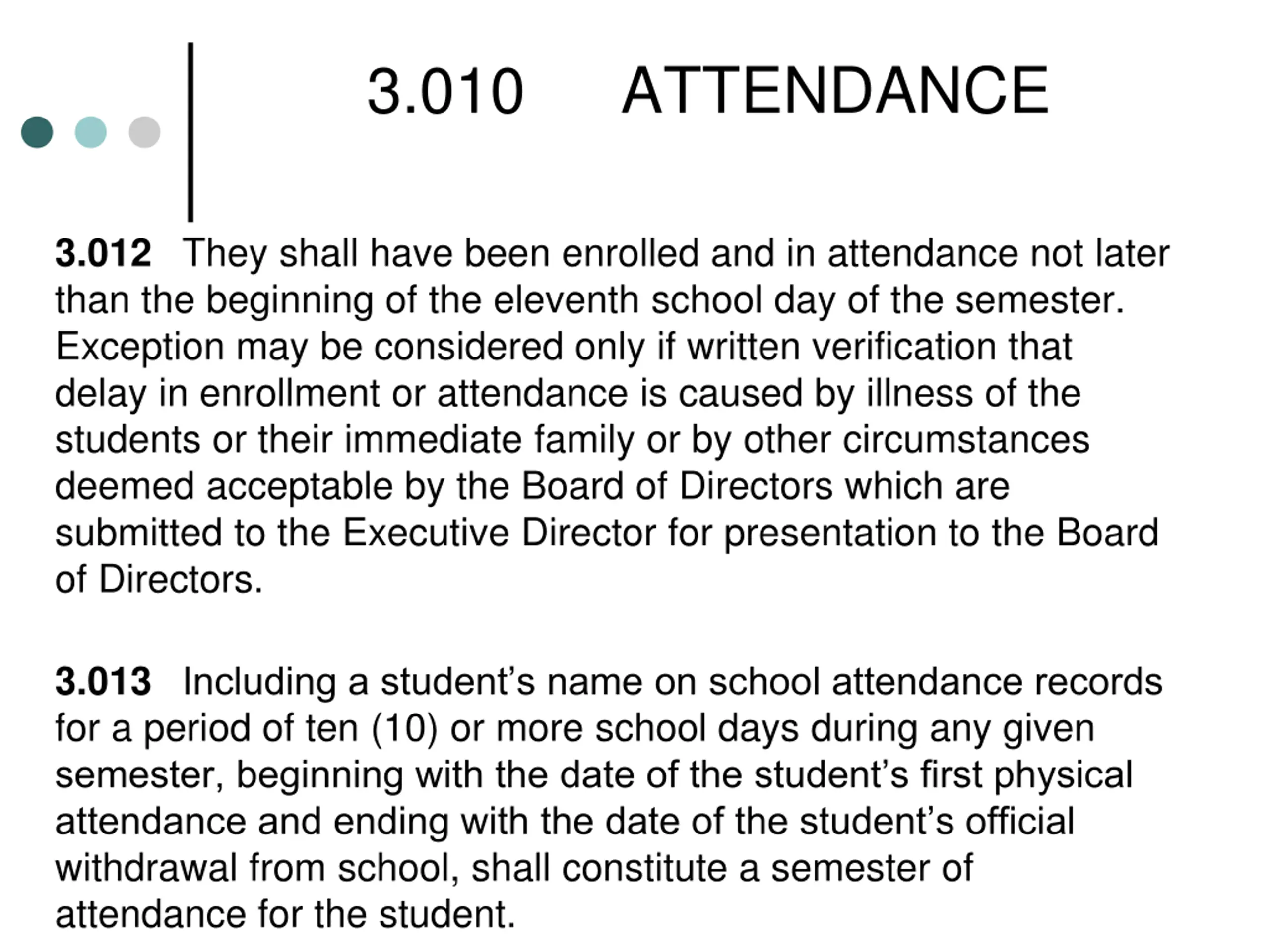 3.010 ATTENDANCE 3.012 They shall have been enrolled and in attendance not later than the beginning of the eleventh school day of the semester. Exception may be considered only if written verification that delay in enrollment or attendance is caused by illness of the students or their immediate family or by other circumstances deemed acceptable by the Board of Directors which are submitted to the Executive Director for presentation to the Board of Directors. 3.013 Including a student s name on school attendance records for a period of ten (10) or more school days during any given semester, beginning with the date of the student s first physical attendance and ending with the date of the student s official withdrawal from school, shall constitute a semester of attendance for the student.