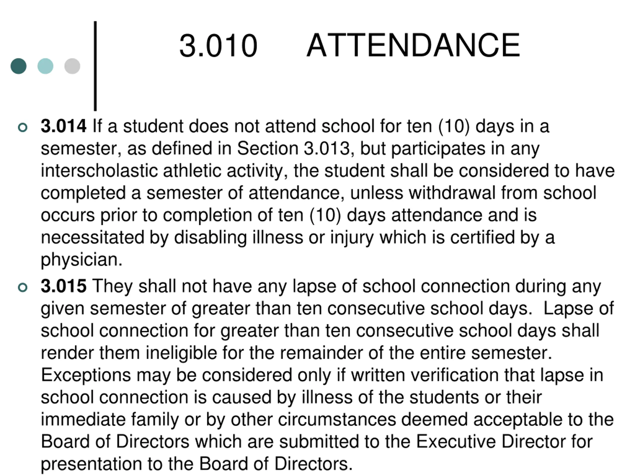 3.010 ATTENDANCE 3.014 If a student does not attend school for ten (10) days in a semester, as defined in Section 3.013, but participates in any interscholastic athletic activity, the student shall be considered to have completed a semester of attendance, unless withdrawal from school occurs prior to completion of ten (10) days attendance and is necessitated by disabling illness or injury which is certified by a physician. 3.015 They shall not have any lapse of school connection during any given semester of greater than ten consecutive school days. Lapse of school connection for greater than ten consecutive school days shall render them ineligible for the remainder of the entire semester. Exceptions may be considered only if written verification that lapse in school connection is caused by illness of the students or their immediate family or by other circumstances deemed acceptable to the Board of Directors which are submitted to the Executive Director for presentation to the Board of Directors.