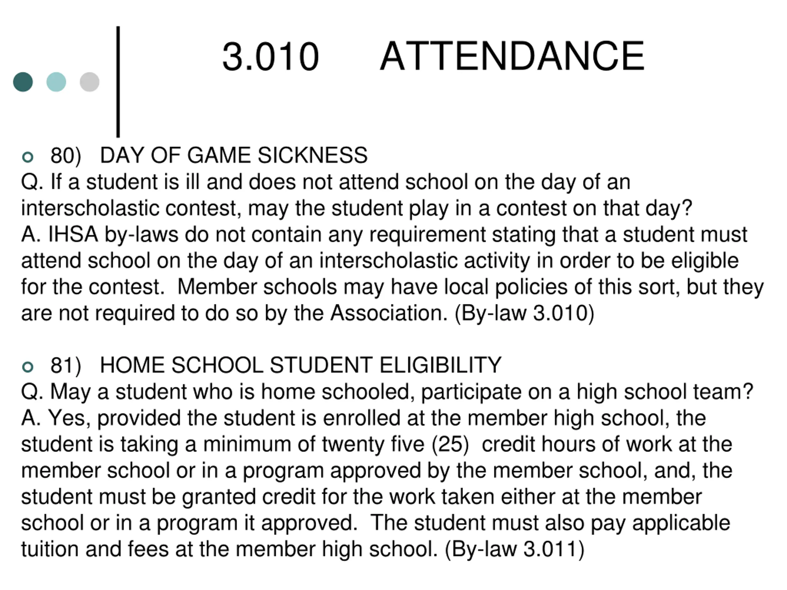 3.010 ATTENDANCE 80) DAY OF GAME SICKNESS Q. If a student is ill and does not attend school on the day of an interscholastic contest, may the student play in a contest on that day? A. IHSA by-laws do not contain any requirement stating that a student must attend school on the day of an interscholastic activity in order to be eligible for the contest. Member schools may have local policies of this sort, but they are not required to do so by the Association. (By-law 3.010) 81) HOME SCHOOL STUDENT ELIGIBILITY Q. May a student who is home schooled, participate on a high school team? A. Yes, provided the student is enrolled at the member high school, the student is taking a minimum of twenty five (25) credit hours of work at the member school or in a program approved by the member school, and, the student must be granted credit for the work taken either at the member school or in a program it approved. The student must also pay applicable tuition and fees at the member high school. (By-law 3.011)