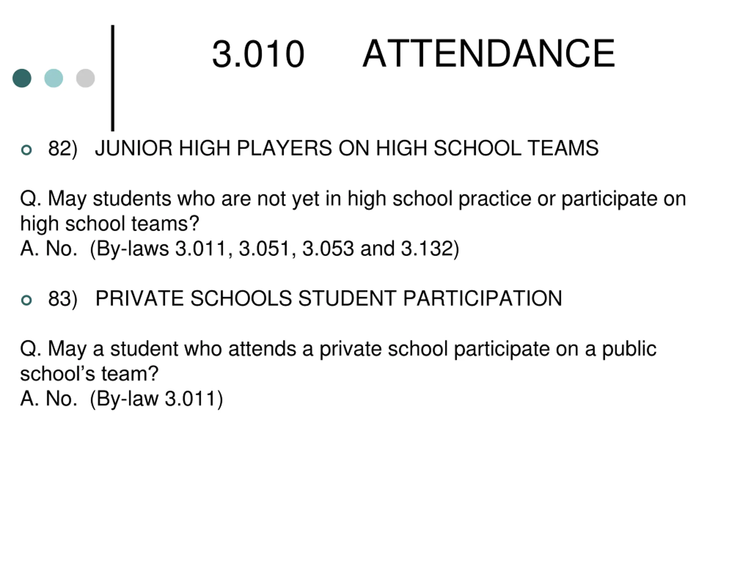 3.010 ATTENDANCE 82) JUNIOR HIGH PLAYERS ON HIGH SCHOOL TEAMS Q. May students who are not yet in high school practice or participate on high school teams? A. No. (By-laws 3.011, 3.051, 3.053 and 3.132) 83) PRIVATE SCHOOLS STUDENT PARTICIPATION Q. May a student who attends a private school participate on a public school s team? A. No. (By-law 3.011)