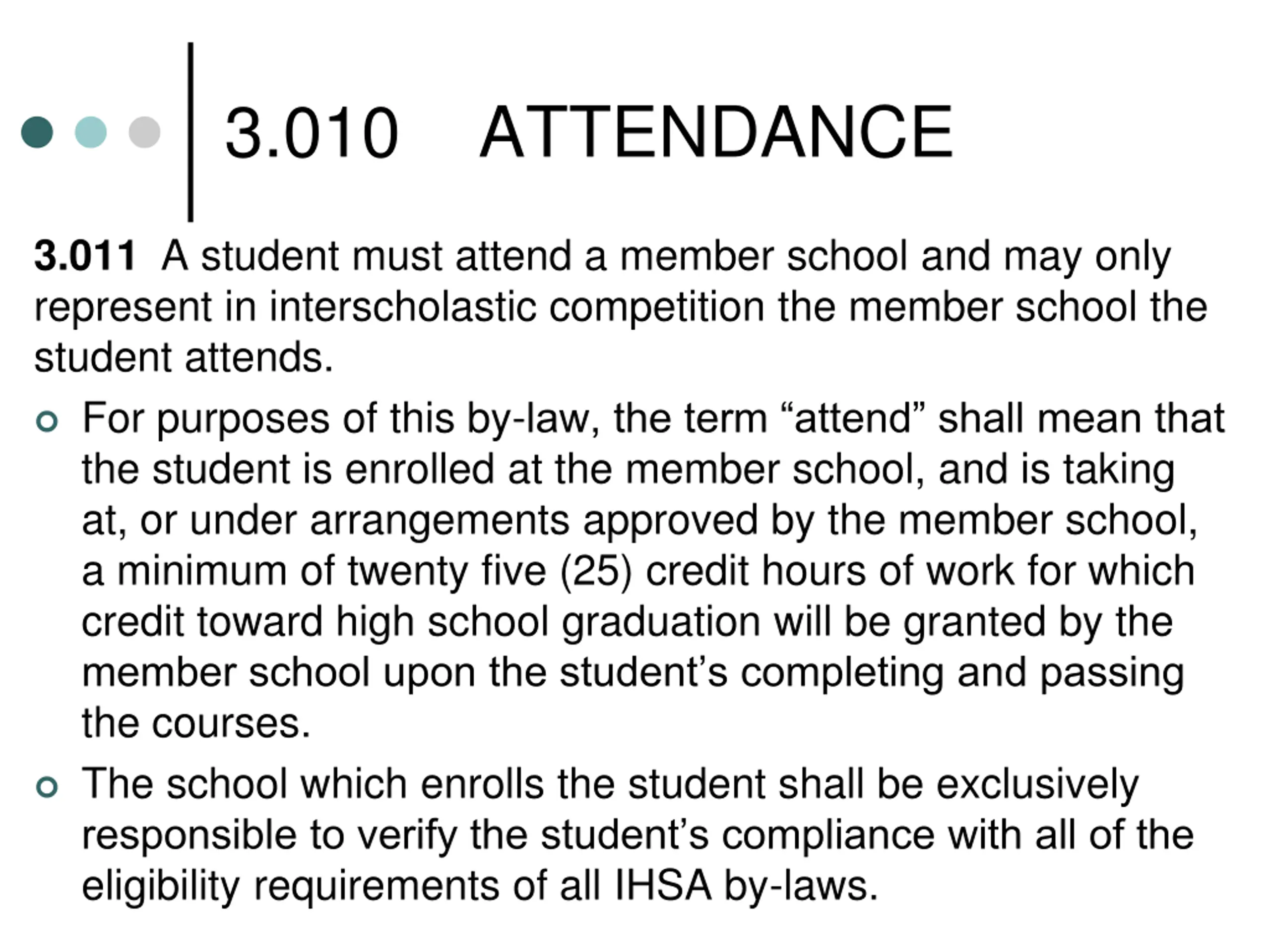 3.010 ATTENDANCE 3.011 A student must attend a member school and may only represent in interscholastic competition the member school the student attends. For purposes of this by-law, the term attend shall mean that the student is enrolled at the member school, and is taking at, or under arrangements approved by the member school, a minimum of twenty five (25) credit hours of work for which credit toward high school graduation will be granted by the member school upon the student s completing and passing the courses. The school which enrolls the student shall be exclusively responsible to verify the student s compliance with all of the eligibility requirements of all IHSA by-laws.