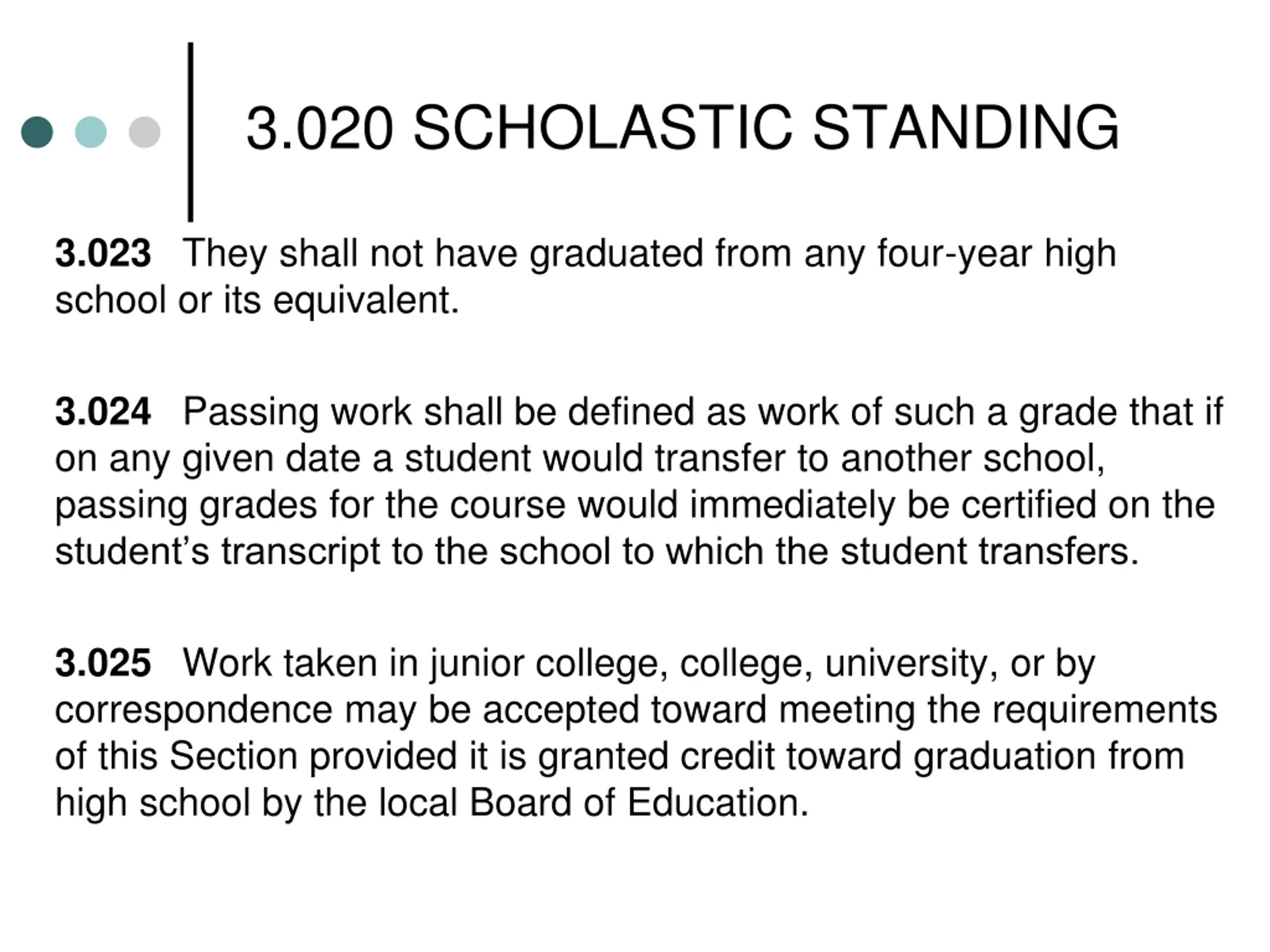 3.020 SCHOLASTIC STANDING 3.023 They shall not have graduated from any four-year high school or its equivalent. 3.024 Passing work shall be defined as work of such a grade that if on any given date a student would transfer to another school, passing grades for the course would immediately be certified on the student s transcript to the school to which the student transfers. 3.025 Work taken in junior college, college, university, or by correspondence may be accepted toward meeting the requirements of this Section provided it is granted credit toward graduation from high school by the local Board of Education.