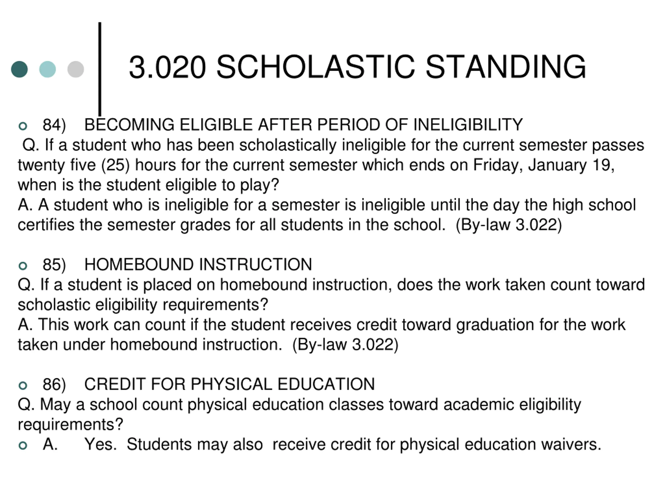 3.020 SCHOLASTIC STANDING 84) Q. If a student who has been scholastically ineligible for the current semester passes twenty five (25) hours for the current semester which ends on Friday, January 19, when is the student eligible to play? A. A student who is ineligible for a semester is ineligible until the day the high school certifies the semester grades for all students in the school. (By-law 3.022) BECOMING ELIGIBLE AFTER PERIOD OF INELIGIBILITY 85) Q. If a student is placed on homebound instruction, does the work taken count toward scholastic eligibility requirements? A. This work can count if the student receives credit toward graduation for the work taken under homebound instruction. (By-law 3.022) HOMEBOUND INSTRUCTION 86) Q. May a school count physical education classes toward academic eligibility requirements? A. Yes. Students may also receive credit for physical education waivers. CREDIT FOR PHYSICAL EDUCATION