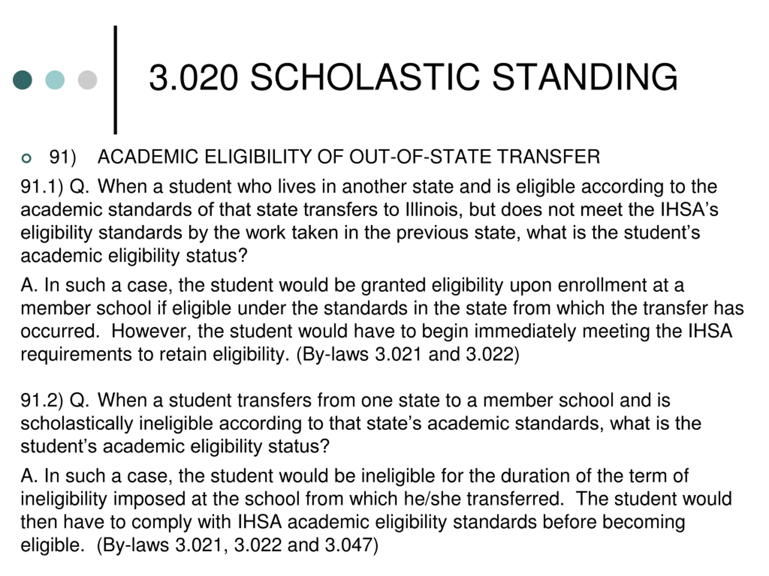 3.020 SCHOLASTIC STANDING 91) 91.1) Q. When a student who lives in another state and is eligible according to the academic standards of that state transfers to Illinois, but does not meet the IHSA s eligibility standards by the work taken in the previous state, what is the student s academic eligibility status? A. In such a case, the student would be granted eligibility upon enrollment at a member school if eligible under the standards in the state from which the transfer has occurred. However, the student would have to begin immediately meeting the IHSA requirements to retain eligibility. (By-laws 3.021 and 3.022) ACADEMIC ELIGIBILITY OF OUT-OF-STATE TRANSFER 91.2) Q. When a student transfers from one state to a member school and is scholastically ineligible according to that state s academic standards, what is the student s academic eligibility status? A. In such a case, the student would be ineligible for the duration of the term of ineligibility imposed at the school from which he/she transferred. The student would then have to comply with IHSA academic eligibility standards before becoming eligible. (By-laws 3.021, 3.022 and 3.047)