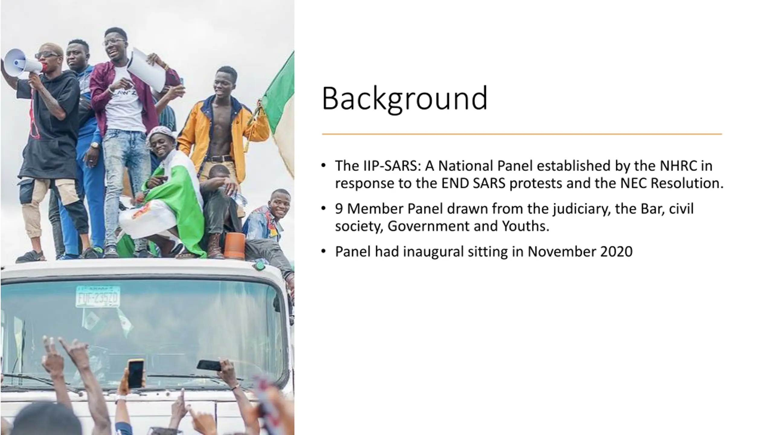 Background The IIP-SARS: A National Panel established by the NHRC in response to the END SARS protests and the NEC Resolution. 9 Member Panel drawn from the judiciary, the Bar, civil society, Government and Youths. Panel had inaugural sitting in November 2020