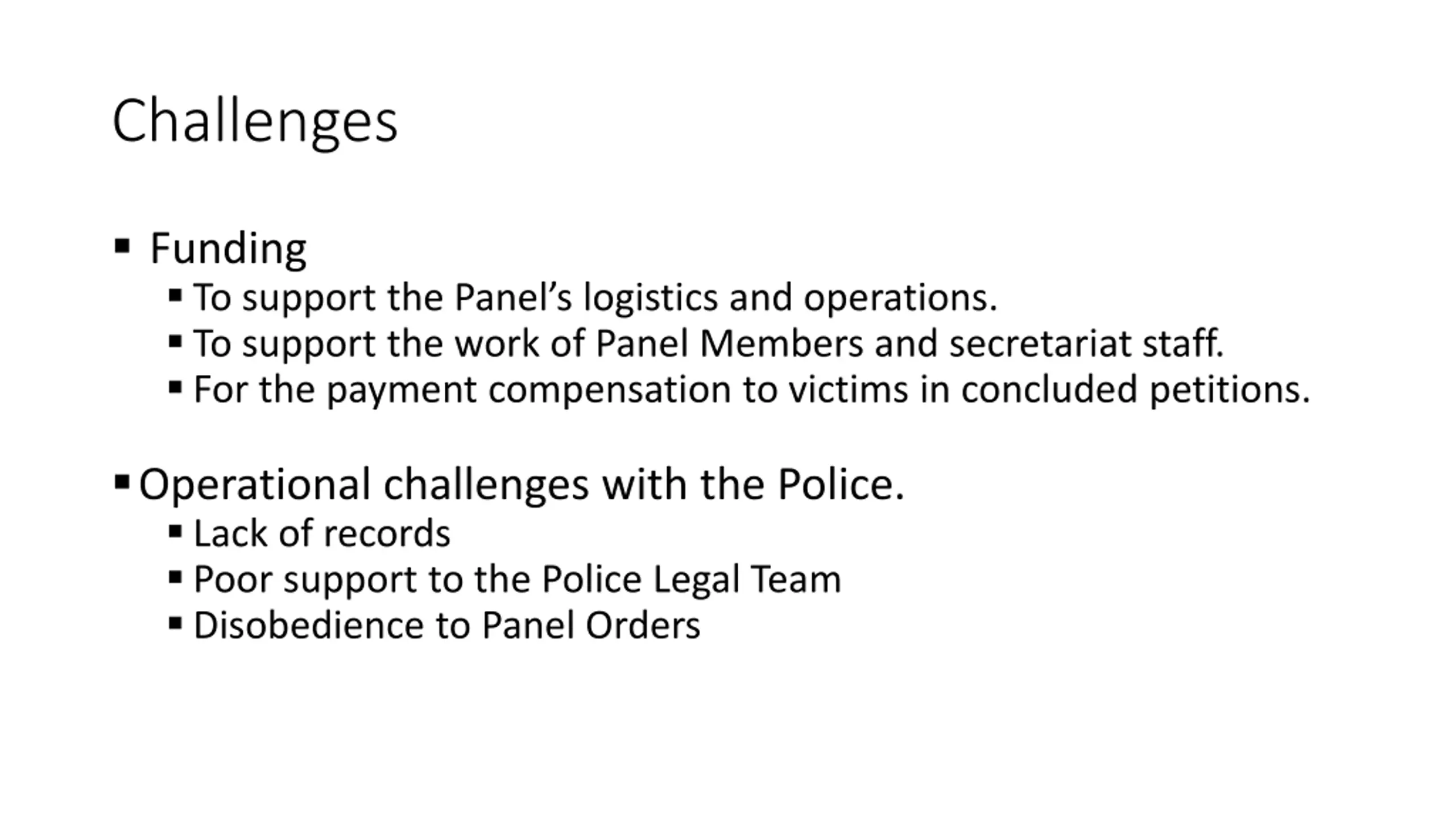 Challenges Funding To support the Panel s logistics and operations. To support the work of Panel Members and secretariat staff. For the payment compensation to victims in concluded petitions. Operational challenges with the Police. Lack of records Poor support to the Police Legal Team Disobedience to Panel Orders