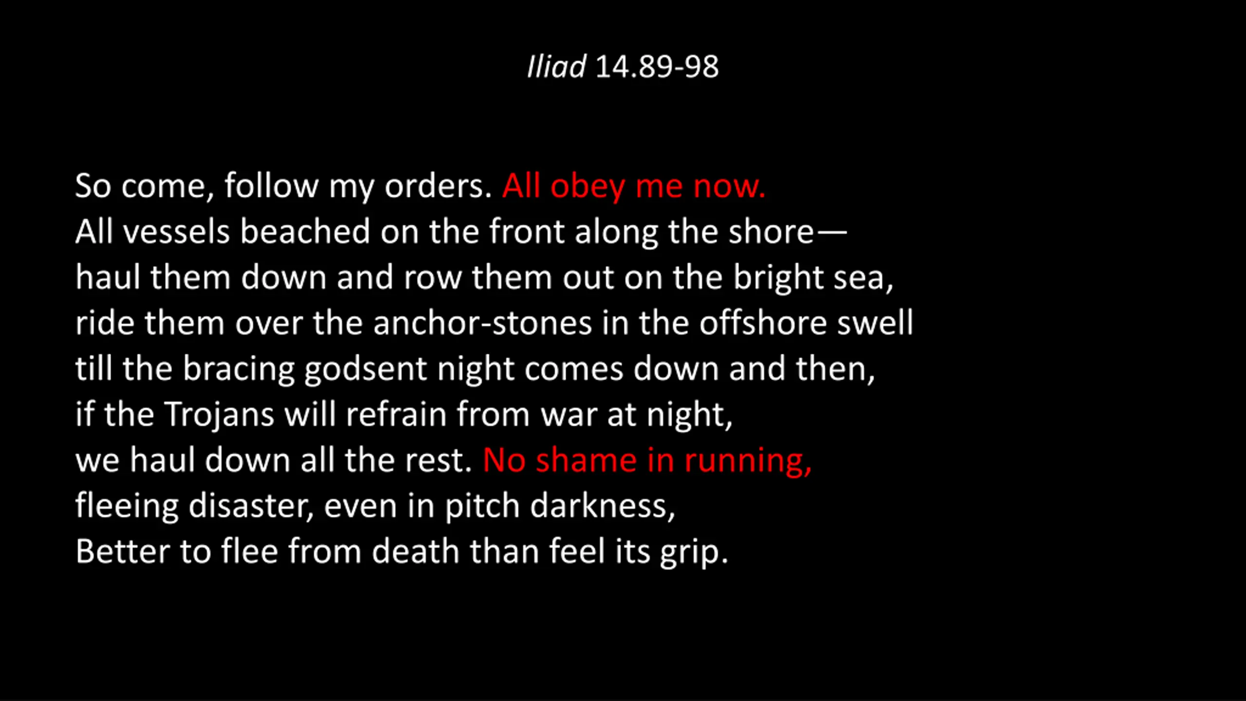 Iliad 14.89-98 So come, follow my orders. All obey me now. All vessels beached on the front along the shore haul them down and row them out on the bright sea, ride them over the anchor-stones in the offshore swell till the bracing godsent night comes down and then, if the Trojans will refrain from war at night, we haul down all the rest. No shame in running, fleeing disaster, even in pitch darkness, Better to flee from death than feel its grip.