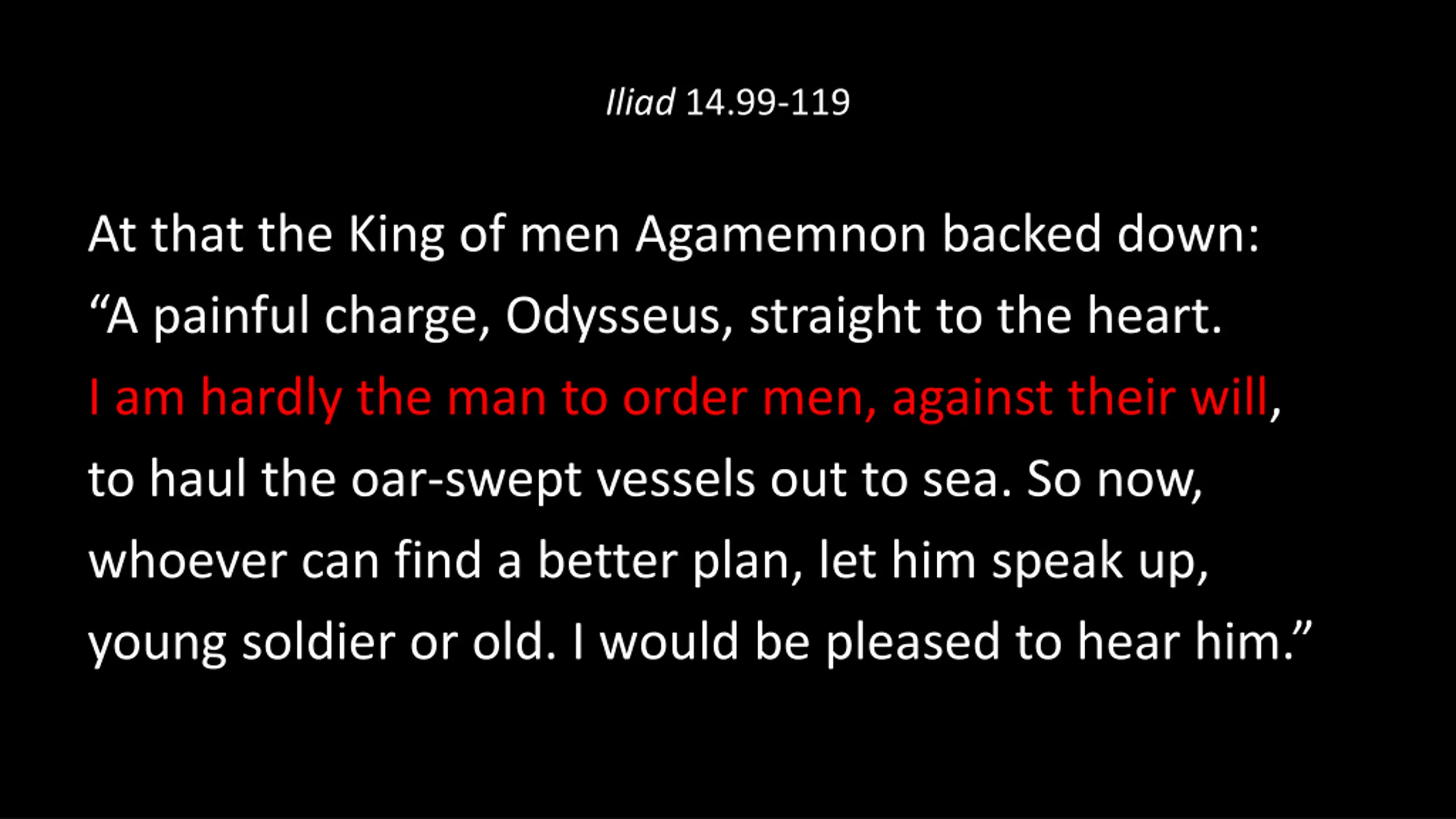 Iliad 14.99-119 At that the King of men Agamemnon backed down: A painful charge, Odysseus, straight to the heart. I am hardly the man to order men, against their will, to haul the oar-swept vessels out to sea. So now, whoever can find a better plan, let him speak up, young soldier or old. I would be pleased to hear him.