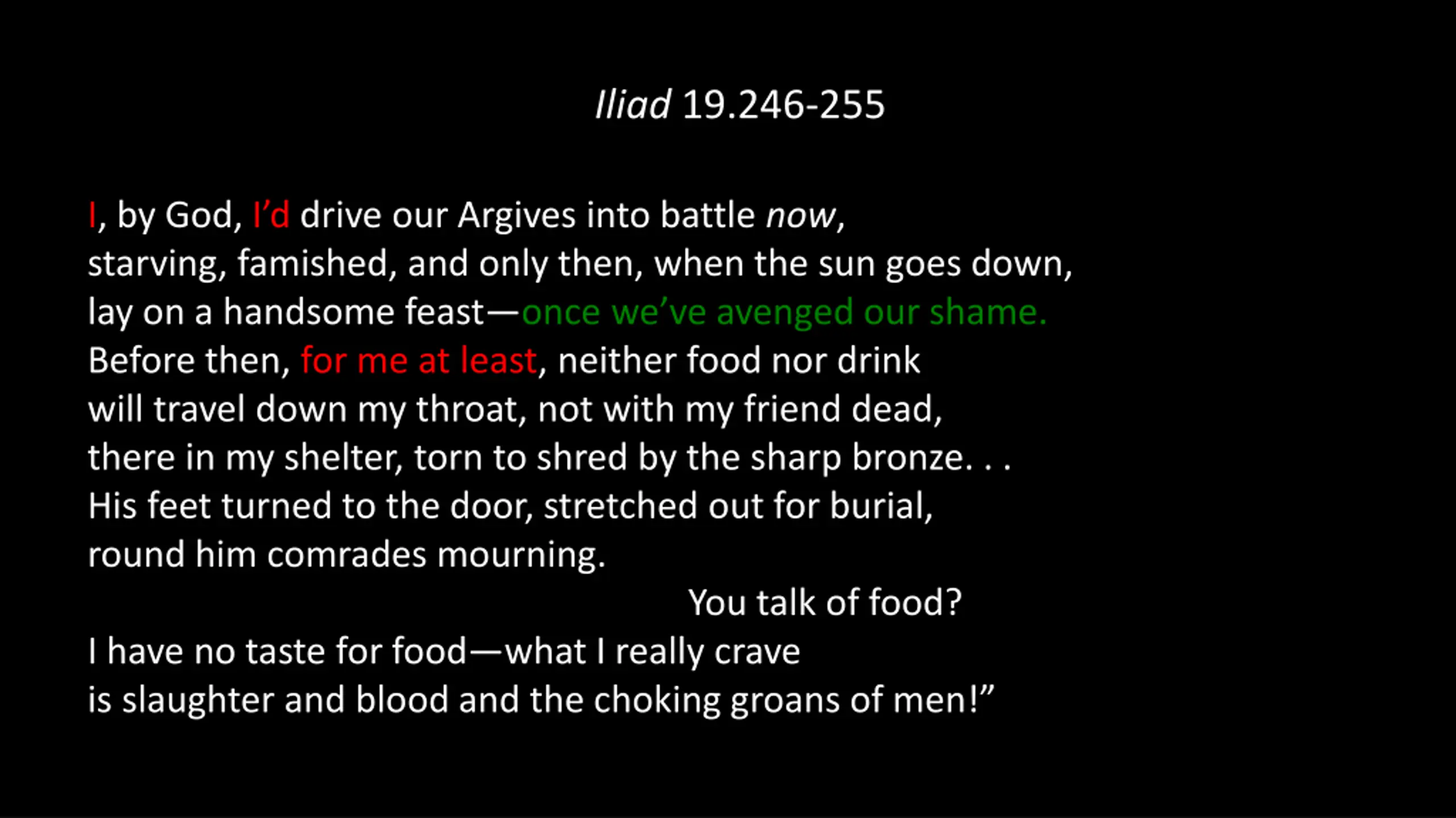 Iliad 19.246-255 I, by God, I d drive our Argives into battle now, starving, famished, and only then, when the sun goes down, lay on a handsome feast once we ve avenged our shame. Before then, for me at least, neither food nor drink will travel down my throat, not with my friend dead, there in my shelter, torn to shred by the sharp bronze. . . His feet turned to the door, stretched out for burial, round him comrades mourning. You talk of food? I have no taste for food what I really crave is slaughter and blood and the choking groans of men!