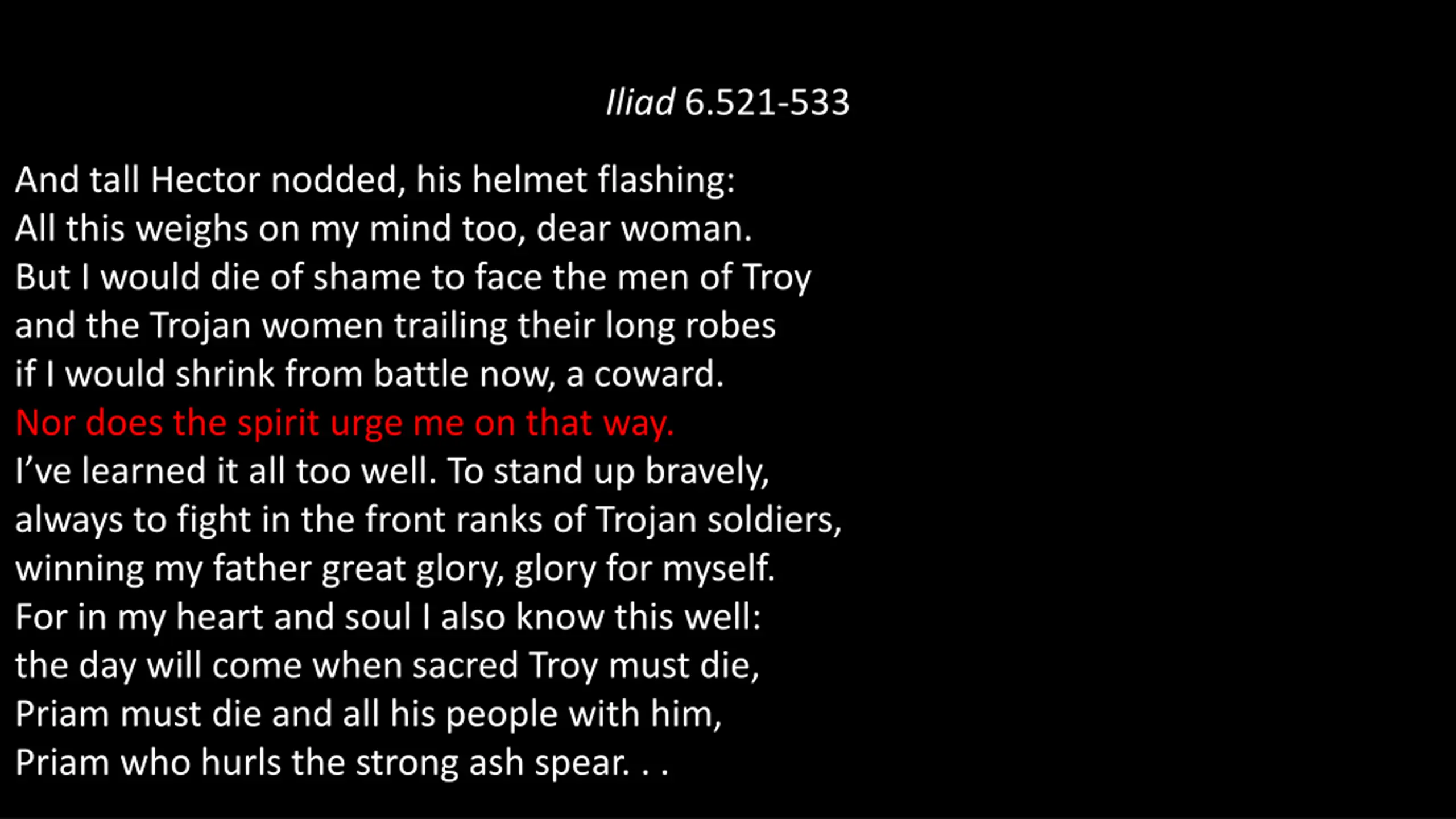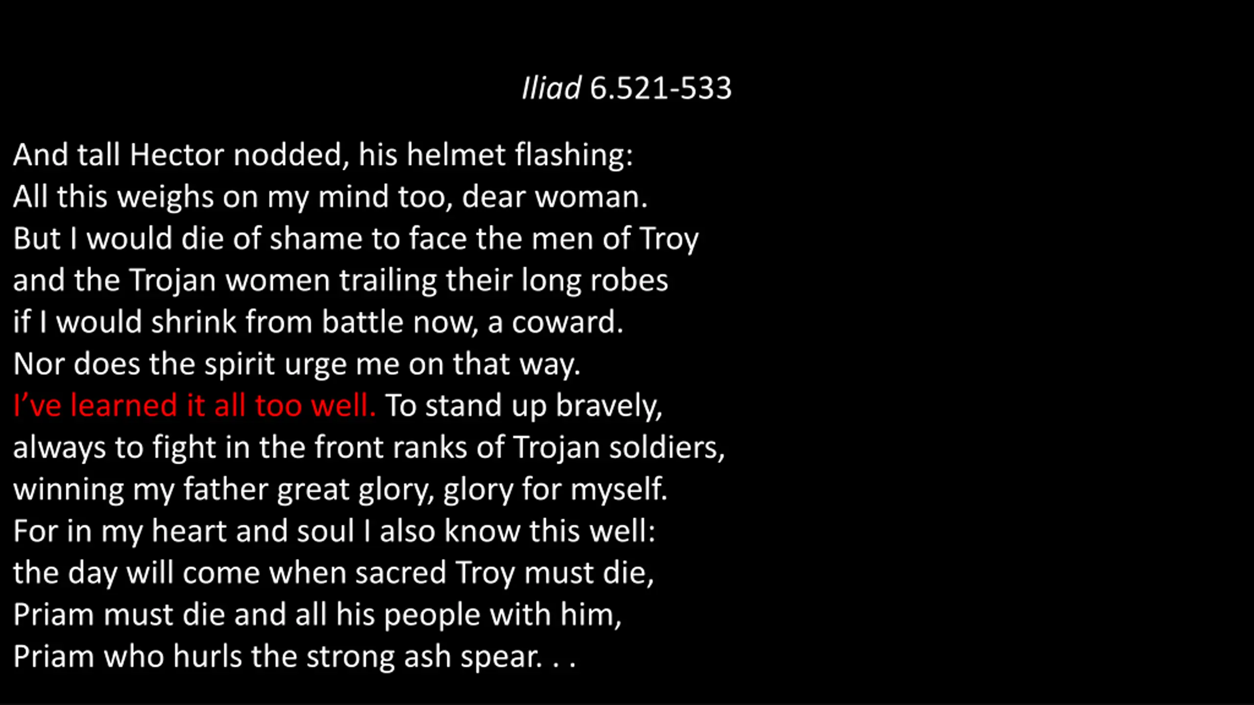 Iliad 6.521-533 And tall Hector nodded, his helmet flashing: All this weighs on my mind too, dear woman. But I would die of shame to face the men of Troy and the Trojan women trailing their long robes if I would shrink from battle now, a coward. Nor does the spirit urge me on that way. I ve learned it all too well. To stand up bravely, always to fight in the front ranks of Trojan soldiers, winning my father great glory, glory for myself. For in my heart and soul I also know this well: the day will come when sacred Troy must die, Priam must die and all his people with him, Priam who hurls the strong ash spear. . .