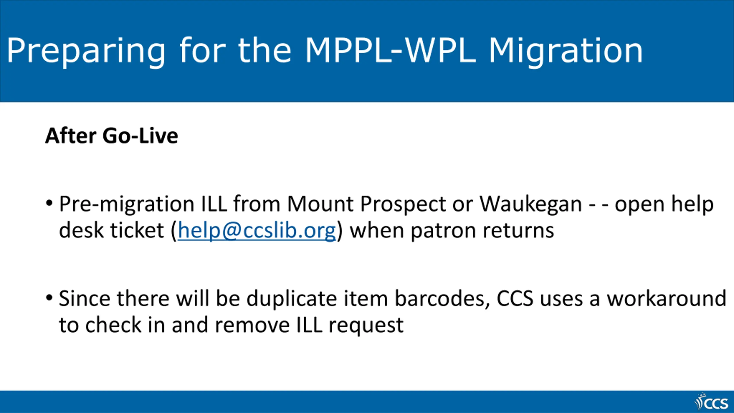 Preparing for the MPPL-WPL Migration After Go-Live Pre-migration ILL from Mount Prospect or Waukegan - - open help desk ticket (help@ccslib.org) when patron returns Since there will be duplicate item barcodes, CCS uses a workaround to check in and remove ILL request