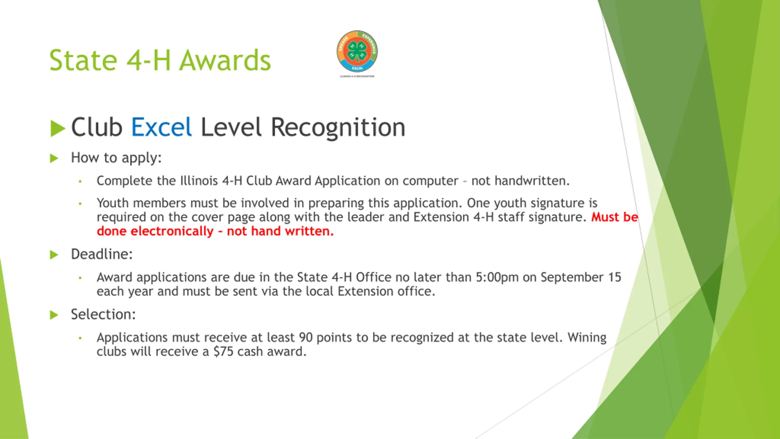 State 4-H Awards Club Excel Level Recognition How to apply: Complete the Illinois 4-H Club Award Application on computer not handwritten. Youth members must be involved in preparing this application. One youth signature is required on the cover page along with the leader and Extension 4-H staff signature. Must be done electronically not hand written. Deadline: Award applications are due in the State 4-H Office no later than 5:00pm on September 15 each year and must be sent via the local Extension office. Selection: Applications must receive at least 90 points to be recognized at the state level. Wining clubs will receive a $75 cash award.