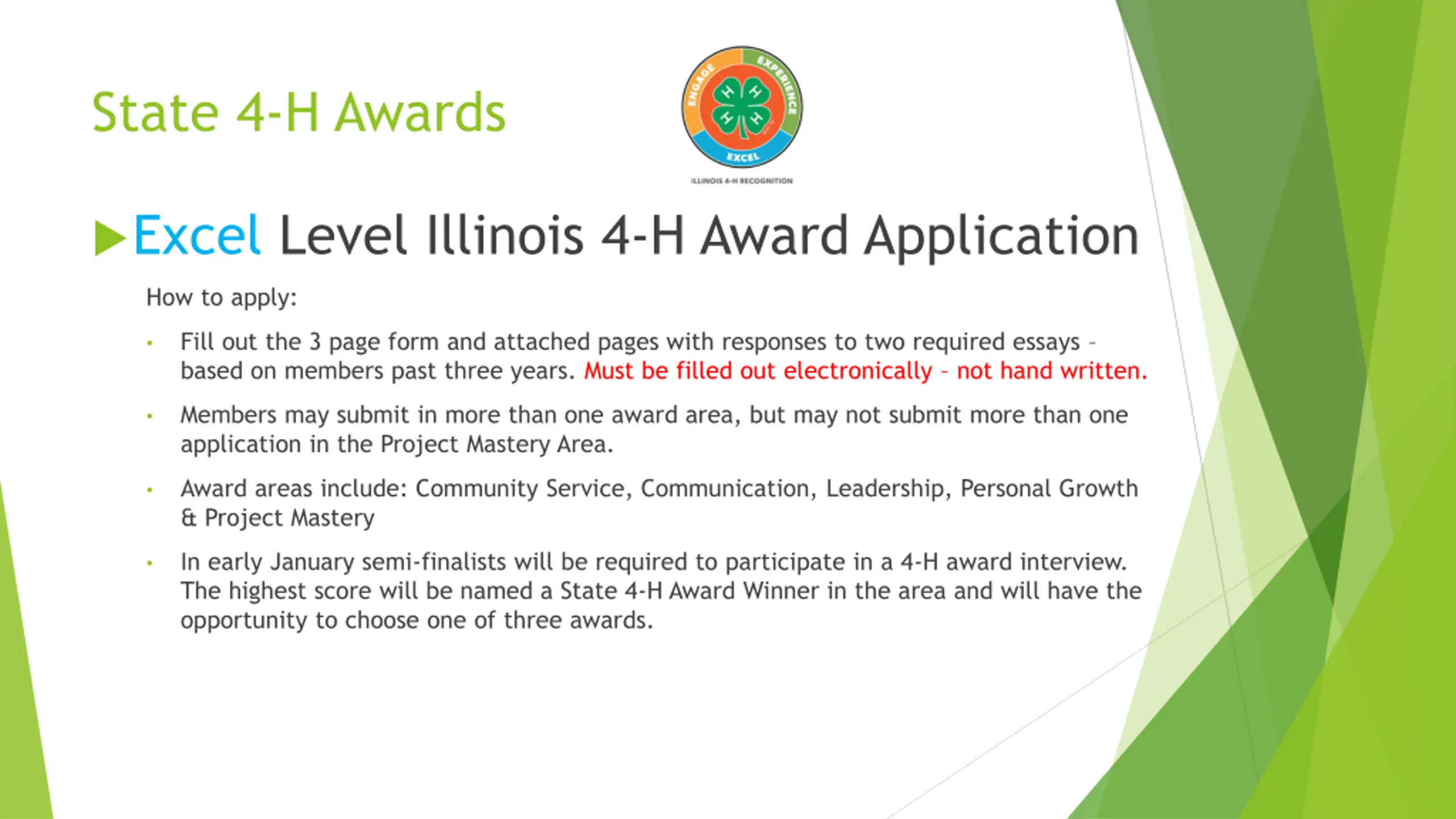 State 4-H Awards Excel Level Illinois 4-H Award Application How to apply: Fill out the 3 page form and attached pages with responses to two required essays based on members past three years. Must be filled out electronically not hand written. Members may submit in more than one award area, but may not submit more than one application in the Project Mastery Area. Award areas include: Community Service, Communication, Leadership, Personal Growth & Project Mastery In early January semi-finalists will be required to participate in a 4-H award interview. The highest score will be named a State 4-H Award Winner in the area and will have the opportunity to choose one of three awards.