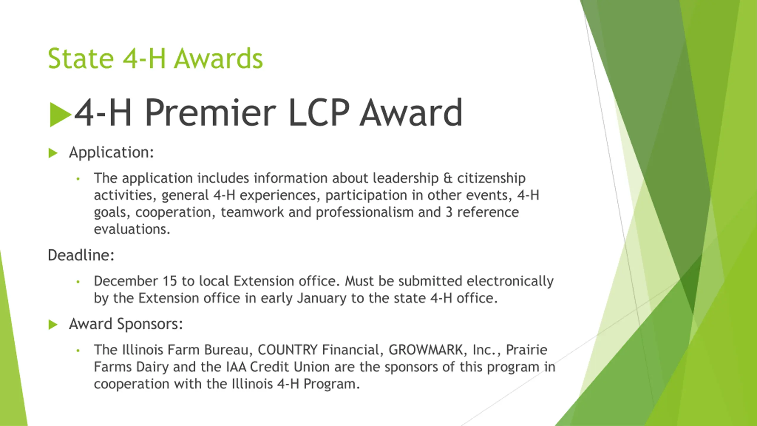 State 4-H Awards 4-H Premier LCP Award Application: The application includes information about leadership & citizenship activities, general 4-H experiences, participation in other events, 4-H goals, cooperation, teamwork and professionalism and 3 reference evaluations. Deadline: December 15 to local Extension office. Must be submitted electronically by the Extension office in early January to the state 4-H office. Award Sponsors: The Illinois Farm Bureau, COUNTRY Financial, GROWMARK, Inc., Prairie Farms Dairy and the IAA Credit Union are the sponsors of this program in cooperation with the Illinois 4-H Program.