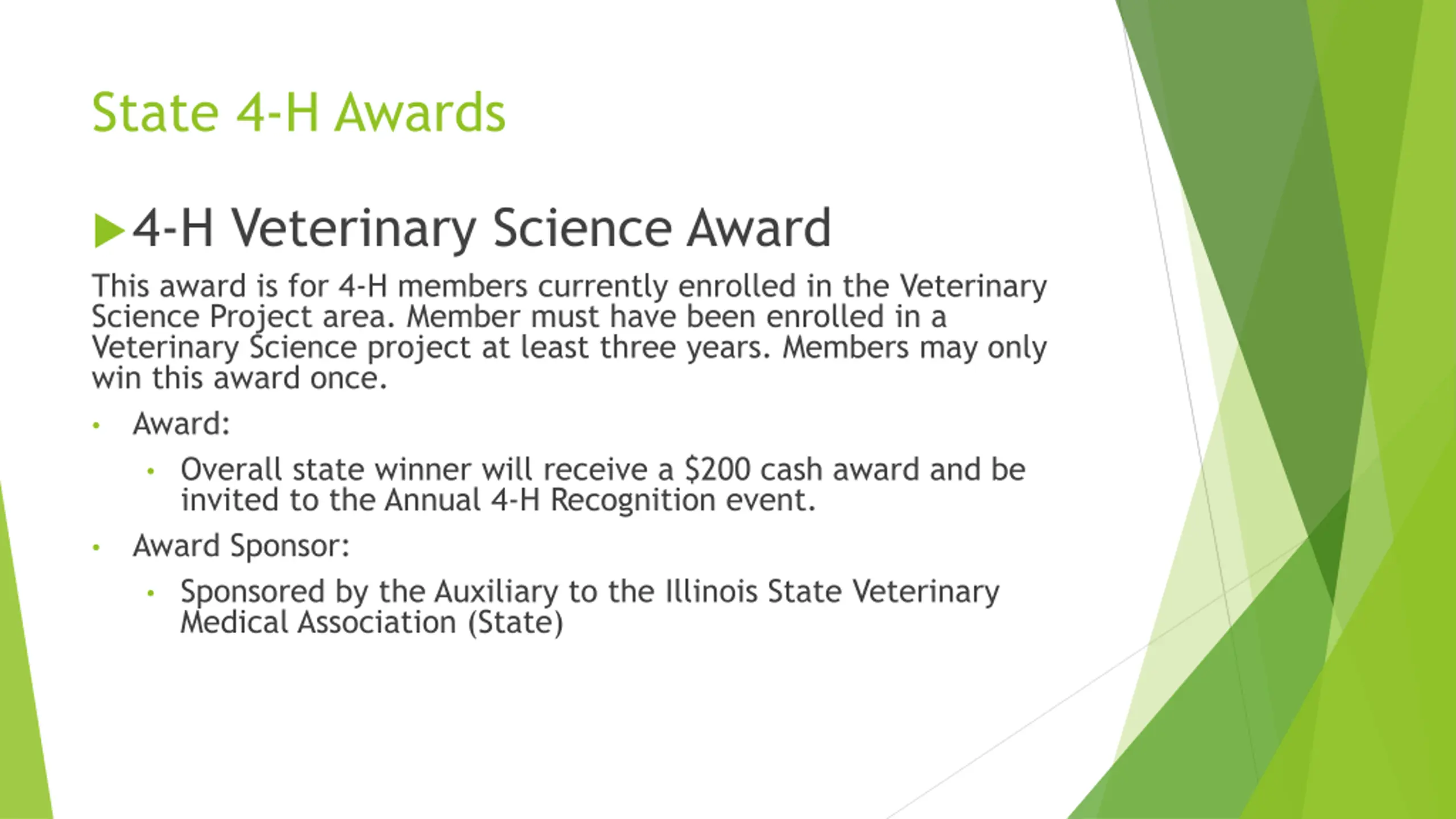 State 4-H Awards 4-H Veterinary Science Award This award is for 4-H members currently enrolled in the Veterinary Science Project area. Member must have been enrolled in a Veterinary Science project at least three years. Members may only win this award once. Award: Overall state winner will receive a $200 cash award and be invited to the Annual 4-H Recognition event. Award Sponsor: Sponsored by the Auxiliary to the Illinois State Veterinary Medical Association (State)