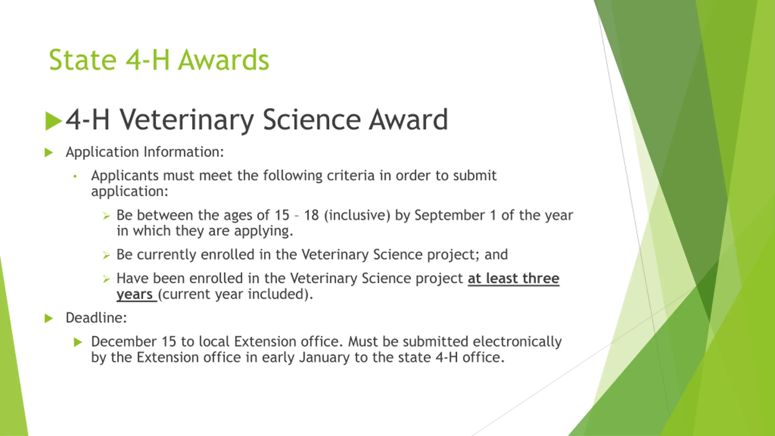 State 4-H Awards 4-H Veterinary Science Award Application Information: Applicants must meet the following criteria in order to submit application: Be between the ages of 15 18 (inclusive) by September 1 of the year in which they are applying. Be currently enrolled in the Veterinary Science project; and Have been enrolled in the Veterinary Science project at least three years (current year included). Deadline: December 15 to local Extension office. Must be submitted electronically by the Extension office in early January to the state 4-H office.