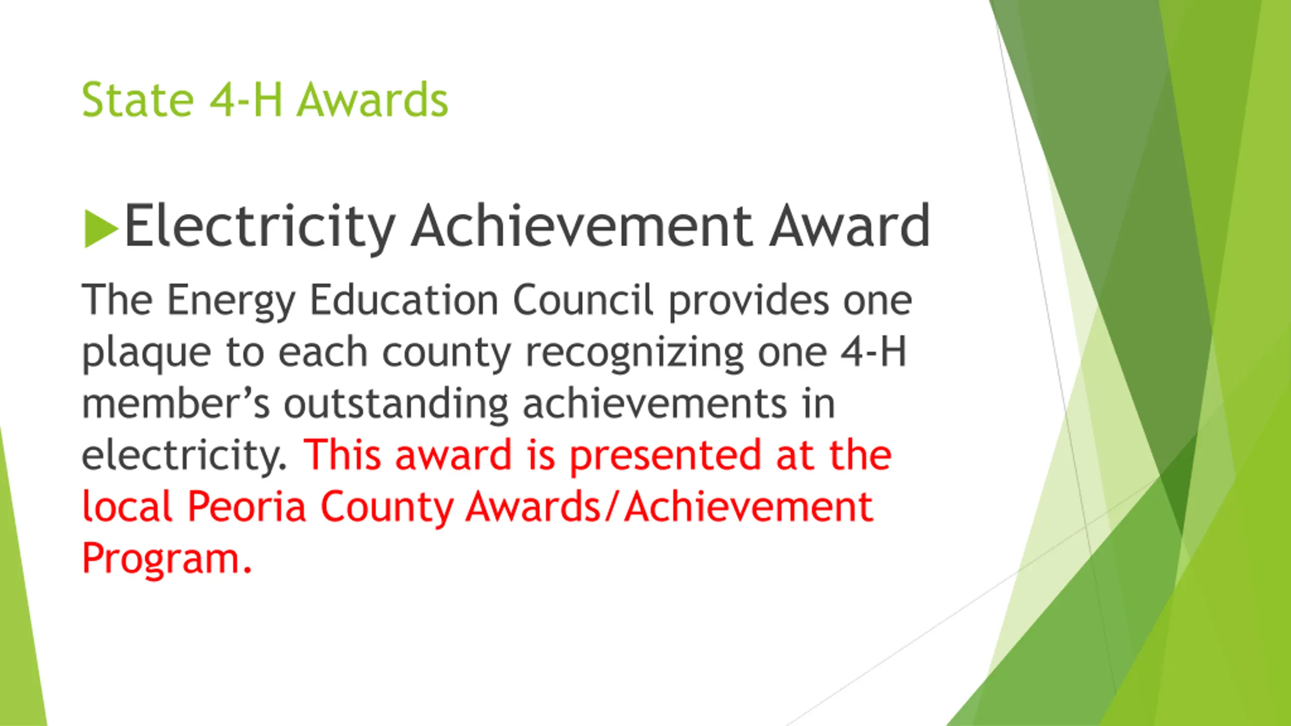 State 4-H Awards Electricity Achievement Award The Energy Education Council provides one plaque to each county recognizing one 4-H member s outstanding achievements in electricity. This award is presented at the local Peoria County Awards/Achievement Program.