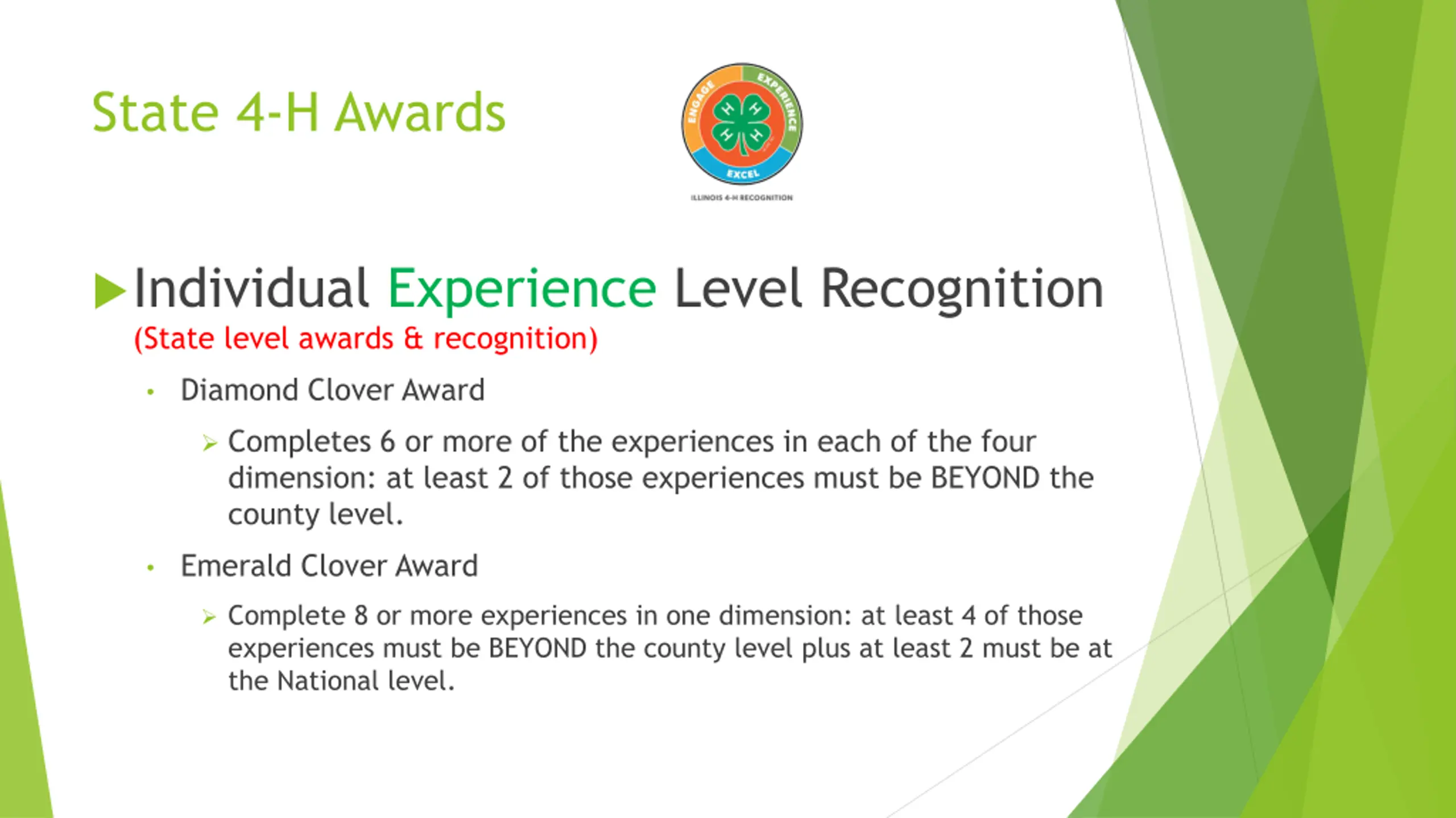 State 4-H Awards Individual Experience Level Recognition (State level awards & recognition) Diamond Clover Award Completes 6 or more of the experiences in each of the four dimension: at least 2 of those experiences must be BEYOND the county level. Emerald Clover Award Complete 8 or more experiences in one dimension: at least 4 of those experiences must be BEYOND the county level plus at least 2 must be at the National level.